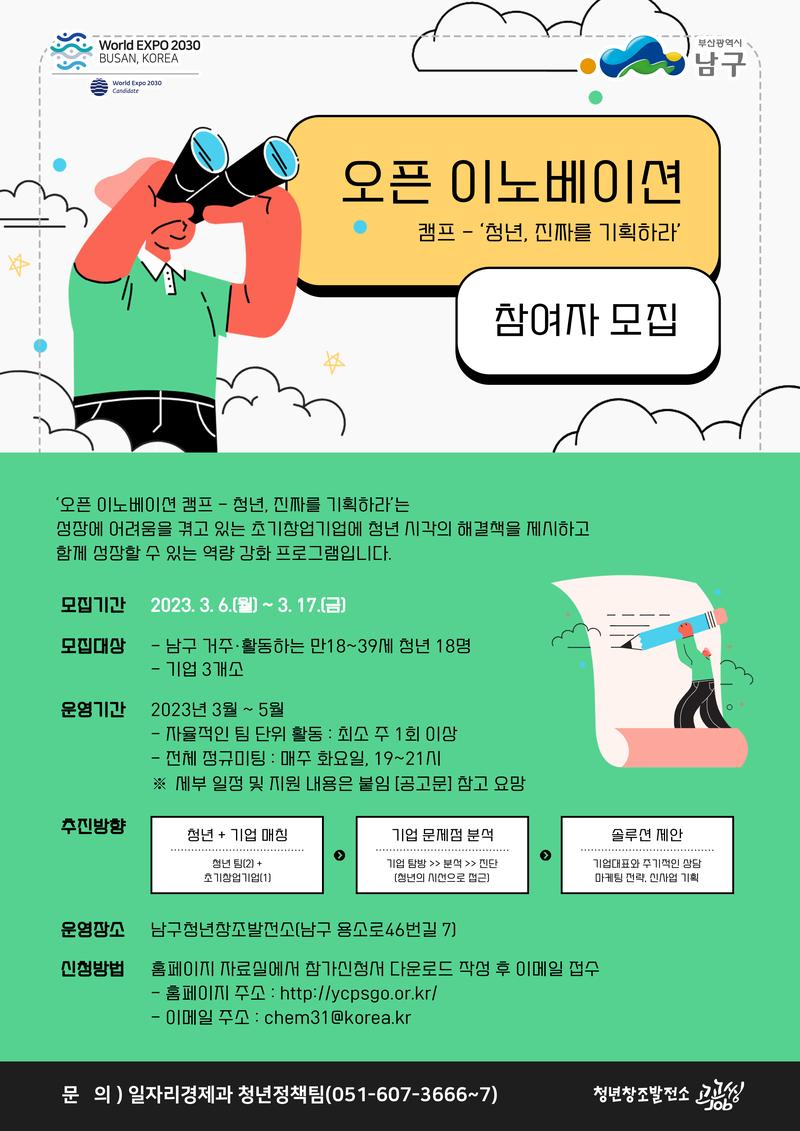 1. 모집기간 : 2023. 3. 6.(월) \~ 3. 17.(금) 2. 모집대상 - 남구에서 거주 또는 활동하는 만18\~39세 청년 18명 - 기업 3개소 3. 운영기간 : 2023. 3. \~ 2023. 5. - 자율적인 팀 단위 활동 : 최소 주 1회 이상 - 전체 정규미팅 : 매주 화요일\, 19\~21시 ※ 세부 일정 및 지원 내용은 붙임 [공고문] 참고 요망 4. 추진방향 - 청년과 기업 매칭 >> 기업 문제점 분석 >> 솔루션 제안 5. 운영장소 : 남구청년창조발전소(남구 용소로46번길 7) 6. 접수방법 : 아래 첨부파일에서 신청서 다운로드 작성 후 이메일 접수 - 홈페이지 주소 : http://ycpsgo.or.kr/ - 접수 이메일 : chem31@korea.kr 7. 문 의 처 : 일자리경제과 청년정책팀(051-607-3666\~7)
