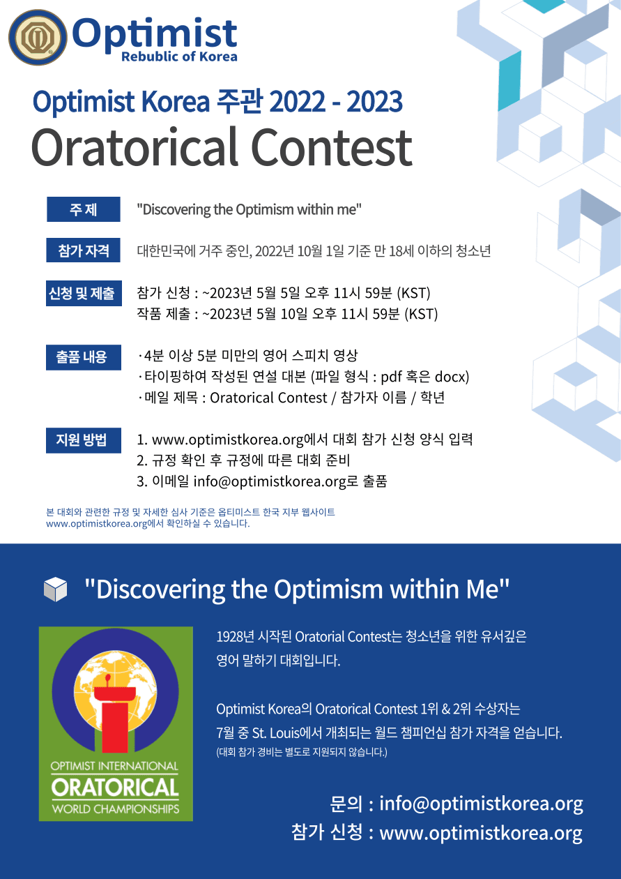 ● 접수 방법 홈페이지에서 참가 신청 입력 폼 작성, 이메일(info@optimistkorea.org)로 영상과 연설 대본 제출 이메일 제목: Oratorical Contest / 참가자 이름 / 학년 파일 제목: Oratorical Contest 영상 / 참가자 이름 / 학년