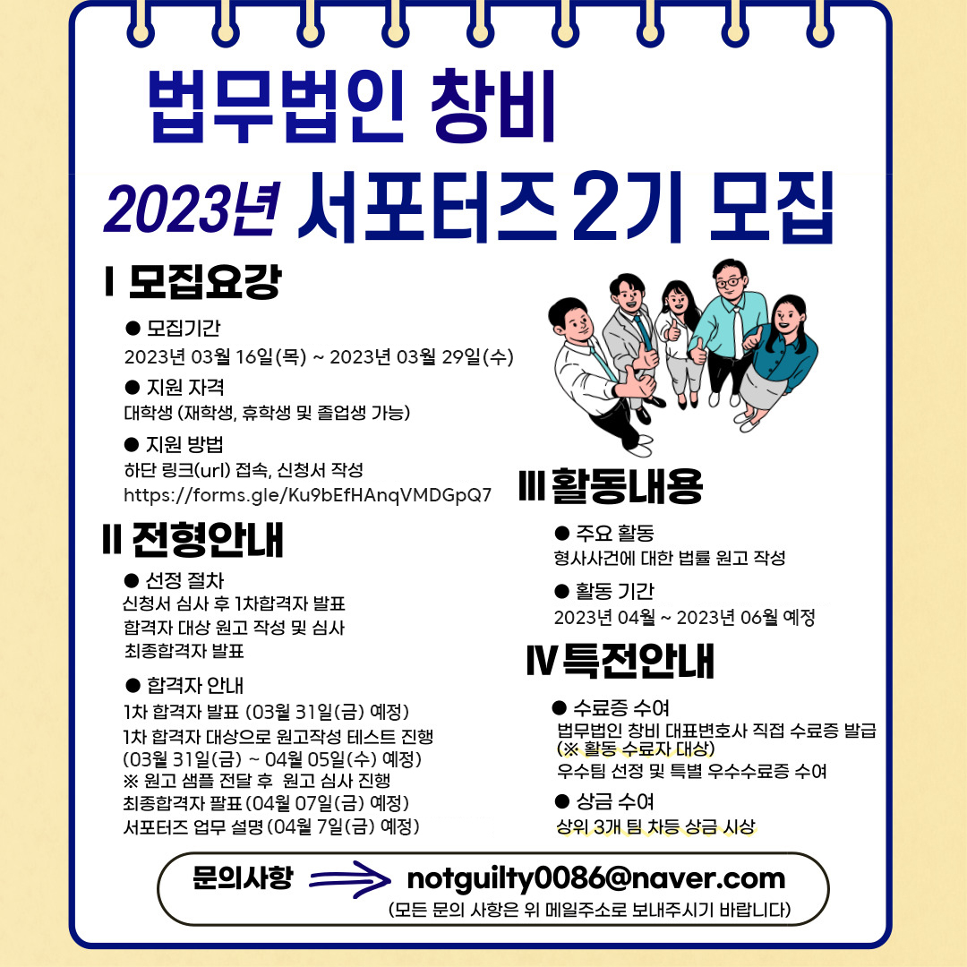 ✨️ 안녕하세요 법무법인 창비입니다. 😊 법무법인 창비에서 3개월간 함께 형사 사건 관련 원고 작성할 인재들을 모집합니다. 👏 법률적 지식이 충분하지 않더라도 평소 글을 작성하는 일에 관심이 많거나, 형사절차 실무 및 법리적 내용을 배우고 싶으신 분들이라면 모두 가능합니다. ❗️비대면 대외활동 가능❗️ 법무법인 창비 서포터즈는 비대면으로 진행되는 대외활동입니다. 활동 기간과 재학 기간이 겹치더라도 부담없이 자유롭게 활동 가능합니다😊 ⭐️ 지원 자격: 형사 사건에 관심이 많고, 법률 내용이 포함된 글을 작성하고 싶은 사람 누구나! (재학생, 휴학 및 졸업생도 가능) ⭐️ 모집 기간: 3월 16일 \~ 3월 29일 ⭐️ 활동 기간: 2023년 4월 \~ 2023년 6월 예정(약 3개월) ⭐️ 지원 방법: 구글폼을 통한 지원 👉https://forms.gle/RosGme8knPqeSJby9 ⭐️ 활동 혜택: 1. 수료증 수여)법무법인 창비 대표변호사 직접 수료증