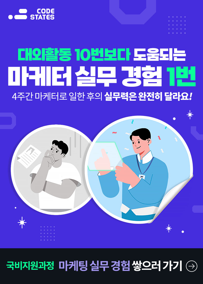 정부지원 과정 14기 선착순 모집 중⭐️수료생 누적 취업률 92%⭐️ 그로스 마케팅, 데이터 분석, 비즈니스적 사고까지! 13주 궁극의 역/량/강/화/ 실무 집중 부트캠프