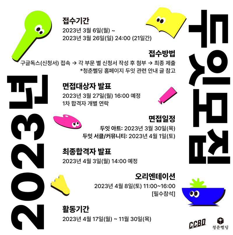 안녕하세요. 청춘삘딩입니다! 🎈2023년 청년시민지원사업 두잇을 모집합니다.