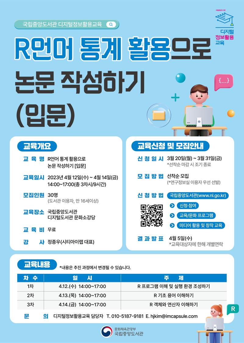 국립중앙도서관 연구정보실에서는 연구자를 위한 "R언어 통계활용으로 논문작성하기[입문]" 교육을 실시합니다. 연구자로서 전문성을 키우고자 하는 분들의 많은 참여 바랍니다. (심화반은 다음달에 개설할 예정이오니, R언어 입문단계이신 분들만 신청해주시기 바랍니다.)