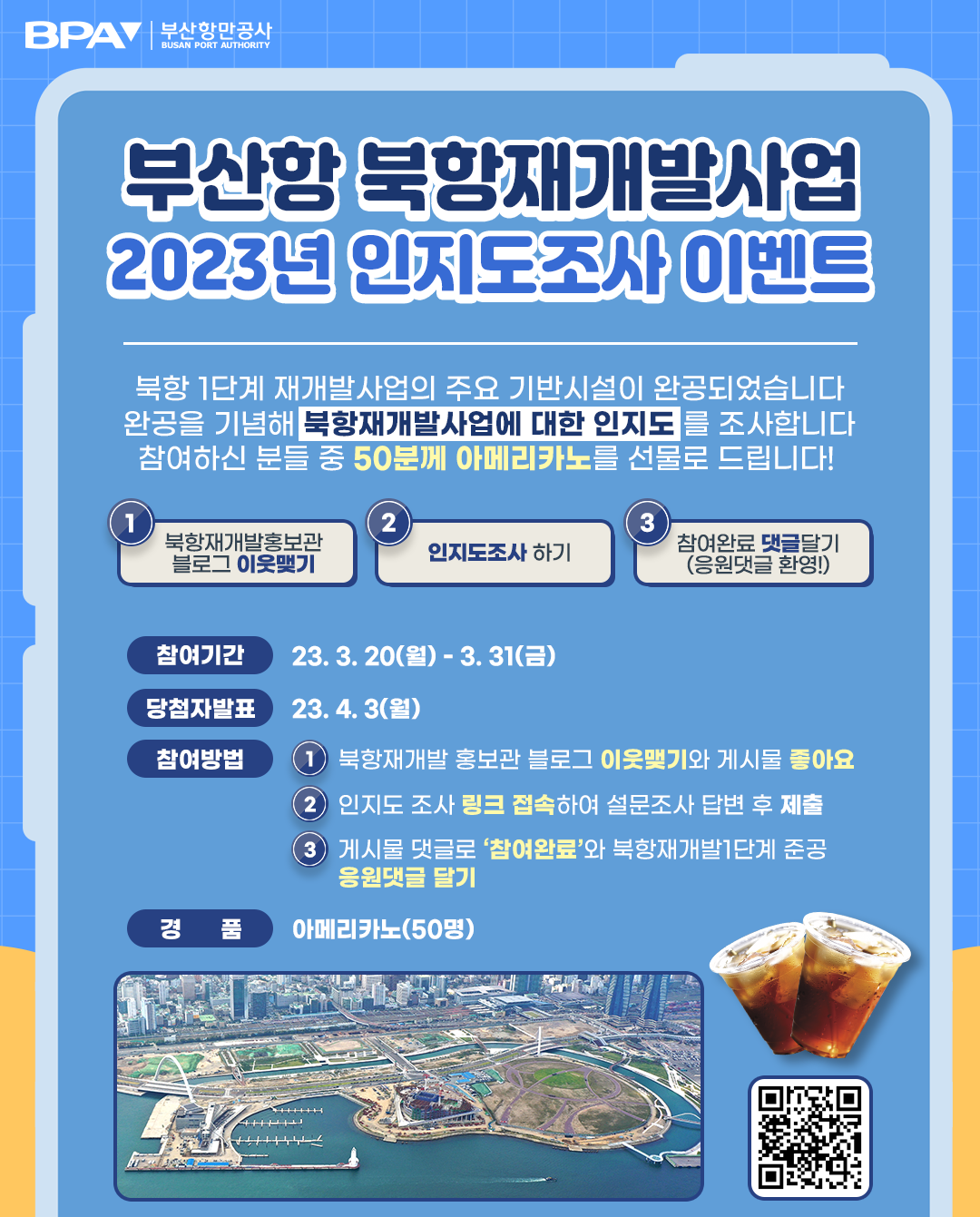 항만기능이 저하된 북항을 국제 관문기능과 친수공간의 조성을 통한 해양관광거점으로 개발하기 위해 시작된 북항재개발사업! 드디어 1단계 주요 기반시설이 완공되었다는 소식을 전합니다! 완공된 주요 기반시설은 도로, 친수공원, 해안조망대, 그리고 경관수로입니다! 북항 1단계 기반시설 완공을 맞아 부산항 북항 재개발 사업에 대한 국민들의 생각과 의견을 듣기 위해 인지도 조사를 진행합니다 인지도조사에 참여하신 분들 중 총 50분을 선정해 아메리카노를 드립니다! - [참여방법] 1. 북항재개발홍보관 블로그 이웃맺기! 게시물 좋아요! 2. 인지도조사 참여하기(링크 참조) 3. 게시물에 ‘참여완료’ 댓글쓰기 * 북항 1단계 기반시설 준공 축하 메시지 및 기대평도 좋아요
