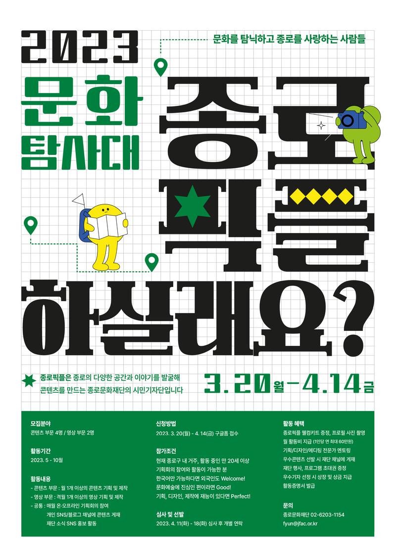 + 문화탐사대 종로픽플 전격모집 + ☆문화를 탐닉하고 종로를 사랑하는 사람들 모여라☆ 종로픽플은? 종로의 다양한 문화 공간과 숨겨진 이야기를 발굴하고, 모두가 함께 즐길 수 있는 문화 콘텐츠를 함께 만드는 종로문화재단의 시민기자단입니다 ★모집기간 : 2023.3.20(월) \~ 4.14(금) ★ 모집분야 : 콘텐츠 부문 4명 / 영상 부문 2명 ★참가조건 - 현재 종로구 내 거주, 활동 중인 20세이상 시민 누구나 - 기획회의 참여와 활동이 가능하다면 ! - 한국어만 가능하다면 외국인도 ! - 문화예술에 진심인 편이라면 ! - SNS/블로그를 운영 중이라면 ! - 기획, 디자인, 영상 제작에 재능이 있다면 ! ★심사 및 선발 : 2023. 4.11(화) \~ 18(화) 심사 후 개별연락 ★활동기간 : 2023. 5 \~ 10월 ★활동내용 콘텐츠 부문 : 월 1개 이상의 콘텐츠 기획 및 제작 영상 부문 : 격월 1개 이상의 영상 기획 및 제작 공통 : 매월 온/오프라인 기획회의 참여 개인 SNS/블로그 채널에 콘텐츠 게재 재단 소식 SNS 홍보 활동 ★신청방법 : 종로문화재단 홈페이지 참조 신청바로가기 하단의 링크를 클릭해 주세요 https://forms.gle/jiW1cUY6GmKvRwxh6