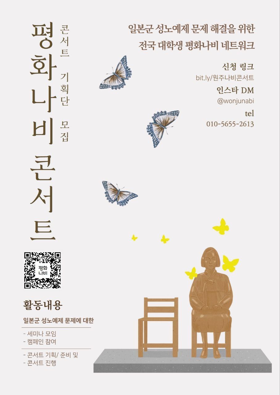 * 모집 대상 - 일본군'위안부'문제를 꼭 해결해야 한다고 생각하는 대학생 * 활동내용 - 일본군'위안부'문제에 대해 알아가는 세미나 - 일본군'위안부'문제 해결을 위한 캠페인\, 콘텐츠 제작 - 콘서트 준비 및 콘서트 진행
