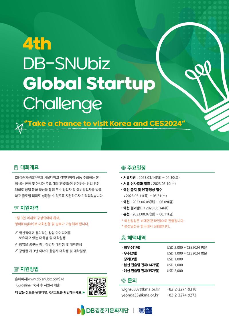 누구보다 빠르게, 업데이트된 소식을 받고 싶다면! 페이스북 👉 https://www.facebook.com/DB-SNUbiz-Global-Startup-Challenge-109894281175703/ 인스타그램 👉 https://www.instagram.com/db_snubiz/ 유튜브 👉 https://www.youtube.com/watch?v=G0YM11WaTu4