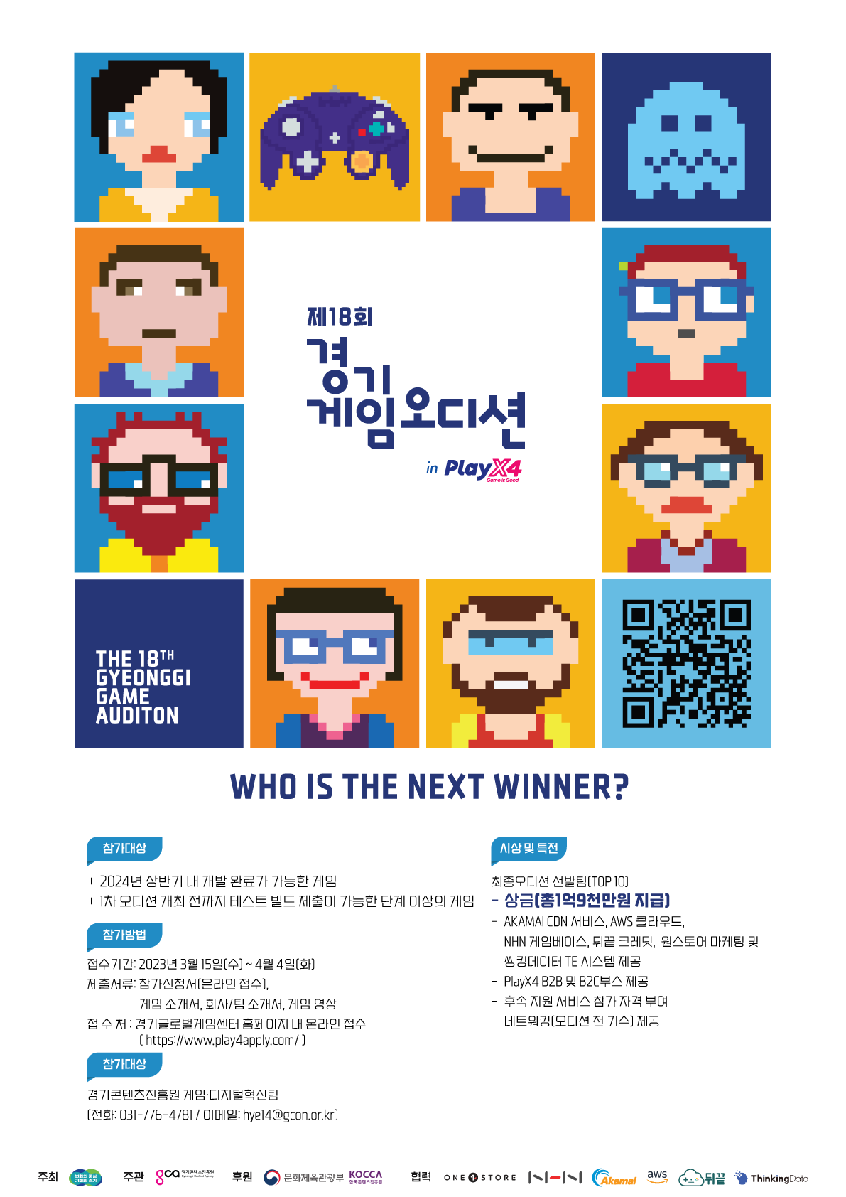 1. 사업개요 - 사업명: 2023년 제18회 경기게임오디션 - 사업기간: 2023년 03월 01일(수) \~ 2023년 11월 30일(목) - 사업목적: 개발이 완료되지 않은 유망 게임을 오디션 형태의 선발심사를 통해 발굴함으로써 스타 게임 프로젝트로 육성
