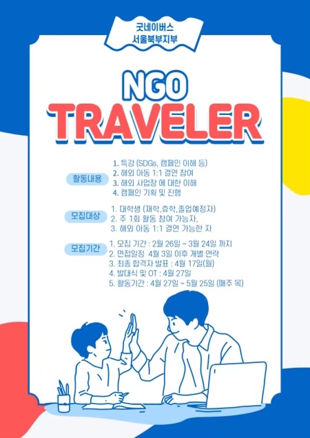 굿네이버스 NGO Traveler 8기 모집** 가치소비, 기후위기, ESG 등등 세상에는 다양한 이슈가 많은데 어떤 시선을 가지고 어떻게 참여하고 변화를 만들어 내야하는 걸까? 나 혼자는 어려울 수 있지만 나와 같은 생각을 하는 사람들을 만난다면 가능하지 않을까? 국내 최초 한국에서 설립된 NGO 굿네이버스와 함께 NGO가 세상을 바꾸는 방식을 만나보세요. 그리고 함께 변화를 이끌어갈 친구들과 새로운 인연을 맺으며 세상을 위한 좋은 변화를 만들어보세요. NGO Traveler는 직접 현장에서 NGO와 SDGs를 이해하고 비영리 마케팅에 기반한 캠페인을 기획/실행하는 프로그램입니다. 현업 NGO 활동가들과 함께하는 더불어 사는 세상을 만들기 위한** 진정성 있는 현장 활동과 이야기에 함께하세요. “Traveler로 활동하면서 사회문제를 조금 더 넓은 시야를 갖고 볼 수 있게 되었어요. 뿐만 아니라 좋은 친구들과 인연을 맺고 나의 의견을 주도적으로 펼쳐볼 수 있다는 부분이 이 활동의 가장 큰 장점 같아요.” - NGO Traveler 5.5기 장0민 - ▶주최사/활동명 [굿네이버스] NGO Traveler 8기 ▶활동혜택 ① 현직 NGO 활동가의 주제별 특강(SDGs의 이해, 캠페인 기획 등) ② 캠페인 기획 및 참여 ③ 기획 포트폴리오 관련 NGO 활동가의 직접 피드백 ④ 각종 자소서에 활용 가능한 자원봉사활동이력 인정(캠페인 기획 및 진행 시간만 해당) ⑤ NGO Traveler 수료증 및 캠페인 시상식 ▶모집대상/활동지역 ① 대학생 (재학, 휴학, 졸업예정자 가능) ② 4월27일(목) \~5월25일(목) 5회기 동안 활동이 가능하신 분 (총 5회기) ③ 서울 거주 또는 서울에서 매주 활동 가능하신 분 ④ 1:1해외아동결연 (월 3만원) 나눔 활동 가능하신 분 * NGO Traveler는 참가비 대신 생활 속 실천 가능한 나눔 활동으로 세상을 위한 좋은 변화를 함께할 분들을 만나고 싶습니다. ▶모집/활동 일정 ① 서류접수 : 03월 24일(금) 자정까지 ② 서류합격 및 면접일정 : 4월 3일 개별 연락 ③ 최종합격자 발표 : 4월 17일 개별 연락 ④ 발대식 및 활동기간 : 4월 27일(목) \~ 5월 25(목)일 중 총 5회기 ▶지원방법 ① 구글폼 작성 또는 첨부된 신청서 메일 제출 가능 https://docs.google.com/forms/d/e/1FAIpQLSdFBu9yZMuH7fwy8t5PkoO7tLPCj93G_7YywjpkinJcL5cnTw/viewform?usp=sf_link ② 메일 제출 : dkim2@gni.kr ▶굿네이버스 홈페이지 https://seoulnorth.goodneighbors.kr/ ▶문의** 02-971-1391 또는 dkim2@gni.kr