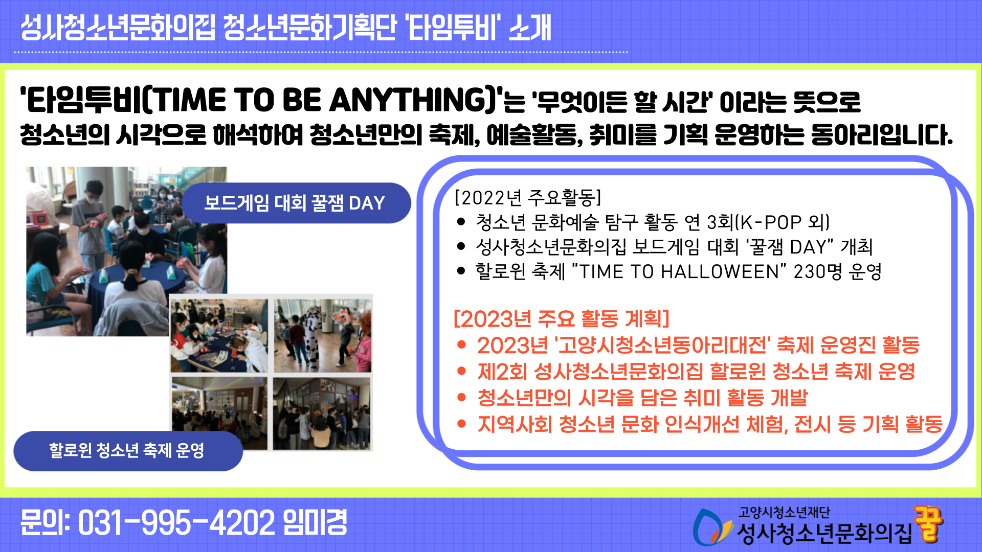 [청소년문화기획단 타임투비 활동 이력 소개] 2021년 성사청소년문화의집 준동아리 등록2021년 코로나19 극복 힐링 버스킹 활동 운영 2022년 K-POP 외 자체 역량강화활동 연3회 2022년 청소년 보드게임 대회 "꿀잼 DAY" 운영 2022년 제1회 타임투비 기획 축제 : 성사청소년문화의집 청소년 할로윈 축제 230명 규모 운영
