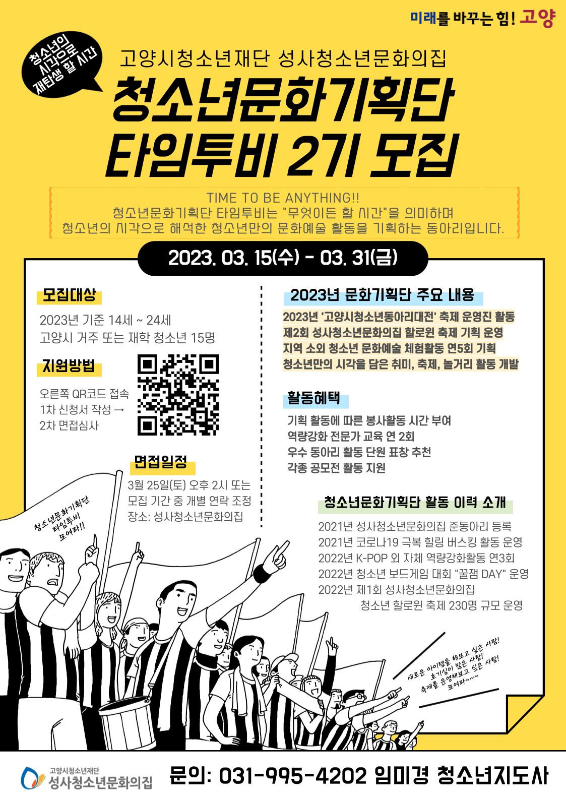 2023년 청소년문화기획단 타임투비 2기 모집 ▶청소년문화기획단 타임투비◀는 TIME TO BE ANYTHING! 즉, 청소년의 시각으로 재탄생시켜 무엇이든 할 수 있다라는 뜻을 가지고 있는 성사청소년문화의집에서 청소년에 의해 만들어진 자치동아리입니다. 2년 차 동아리만큼 새로운 도전을 기다리고 있으며 청소년의 시각으로 청소년이 재해석하여 청소년 축제 운영부터 지역사회 소외 청소년 대상 문화예술체험활동 기획 운영까지 새로운 활동을 함께 할 단원을 모집합니다\~!