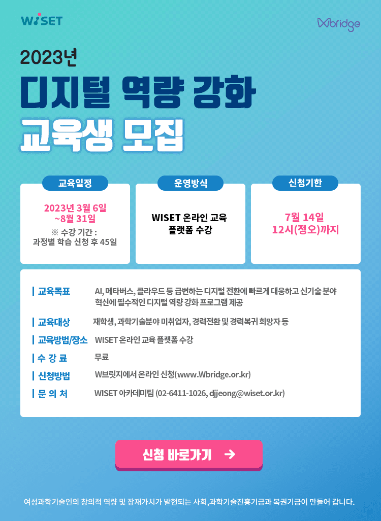 3. 교육 신청 및 수강 (1) 교육 신청 ① W브릿지를 통한 온라인 신청(http://wbridge.or.kr) 완료 ※ 홈페이지 상단 ‘교육>온라인교육>2023년 디지털 역량 강화 교육>신청하기’ → 교육 신청 바로가기 : https://bit.ly/3mxY9pW ※ 첨부파일 : 미취업자의 경우 재학/졸업증명서 첨부, 재직자의 경우 재직 증빙서류(재직증명서 또는 명함) 첨부 ② 온라인 교육 수강페이지 가입 및 수강 신청(https://wiset.step.or.kr) ※ W브릿지에 등록한 이메일주소로 아이디 생성 필수 (중요) ※ 45일 이내 수강 가능한 과정만 우선 신청(7월 16일까지 추가 신청 가능) ※ 필수 과정 중 1개 과정 이상 우선 수강 후 선택 과정 신청 및 수강 권장 ③ 두 개 사이트 모두 신청 후 수강 가능