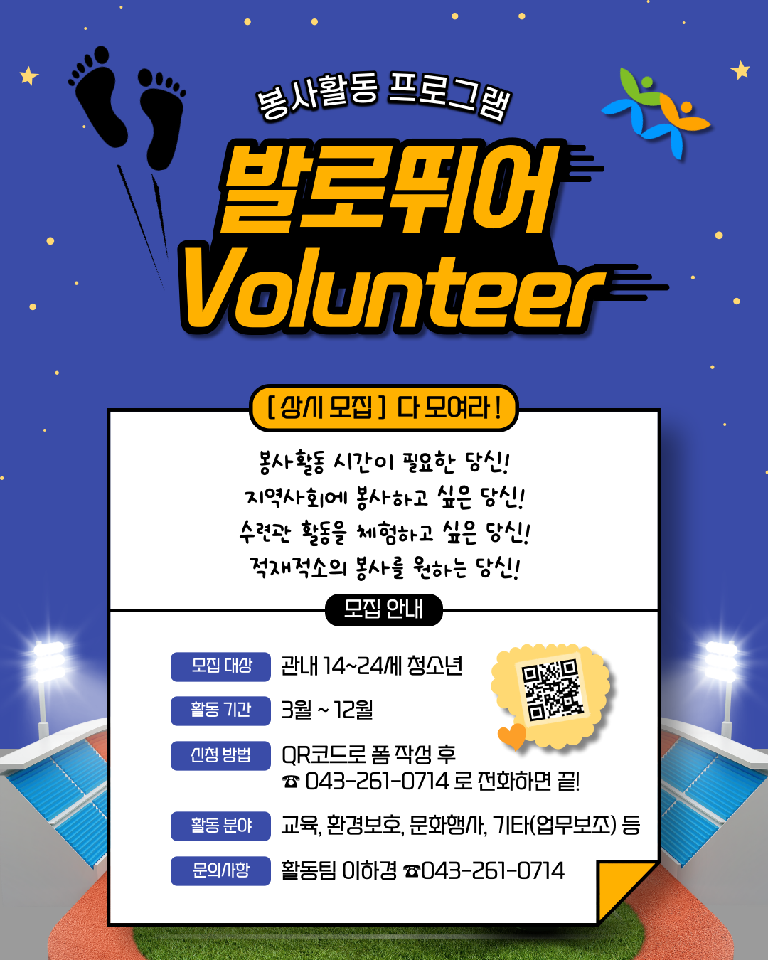 👣 모집대상 : 청주에서 봉사하고 싶은 만14\~24세 청소년 👣 활동기간 : 3월 \~ 12월 👣 활동분야 : 교육, 환경보호, 문화행사, 기타(수련관 내 활동, 업무 보조) 등 👣 신청방법 : QR코드 ( https://naver.me/GPFkf2qV ) 접속 후 043-261-0714 로 전화 👣 문의사항 : ☎ 043-261-0714 활동팀 이하경