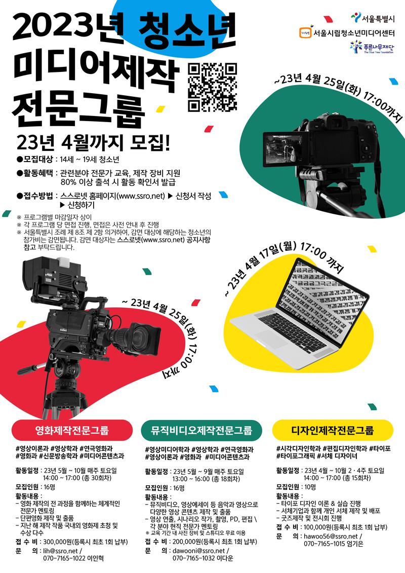 ◆ 모집대상 : 14\~19세 청소년 ◆ 모집일정 : 영화/뮤직비디오 \~ 23년 4월 25일(화) 17:00 까지 디자인 \~ 23년 4월 17일 (월) 17:00 까지 ※ 각 프로그램 당 면접 진행 있을 수 있음. 면접은 사전 안내 후 진행
