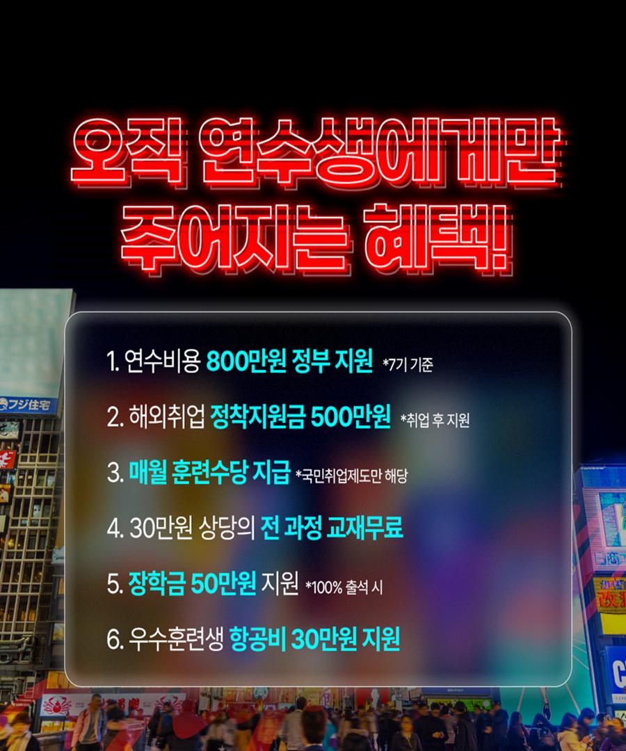1. 연수비용 800만원 정부지원 (자비부담금 : 42만원) 2. 매월 훈련수당 지급(국민취업지원제도만 해당) 3. 30만원 상당의 전 과정 교재 무료 제공 4. 우수훈련생 일본 항공기 30만원 지원 5. 장학금 50만원 지급 (100% 출결 시) 6. 일본 IT기업 취업 후 정착지원금 500만원 지급 7. 일본 IT기업 채용 설명회 8. 채용면접 100%합격을 위한 모의 면접 진행 9. 42개사 일본 IT기업 채용 면접 진행