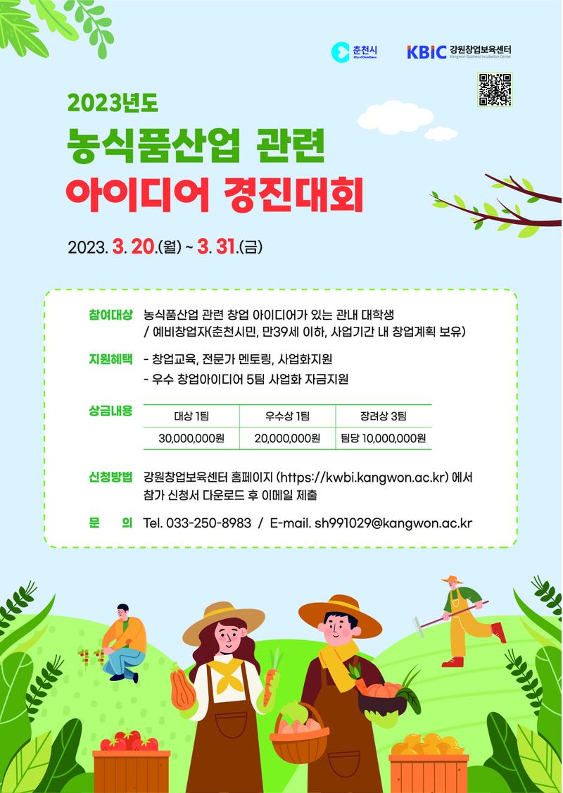 ○ 기간 및 일정 - 2023.3.20.(월)\~2023.3.31.(금), 15:00시까지 ○ 지원자격 - 춘천 관내 대학생 및 예비창업자(춘천시민, 만 39세 이하, 사업기간 내 창업계획 보유) - 신청자 대상 1차 심사를 통해 20팀 선정, 개인 또는 단체(2인 이상)로 참가 가능 ○ 접수방법 - 강원창업보육센터 홈페이지(https://kwbi.kangwon.ac.kr) 에서 참가신청서 다운로드 후 이메일로 참가 신청 ○ 시상내역 - 대상 (1팀) 30,000,000원 우수상 (1팀) 20,000,000원 장려상 (3팀) 팀당 10,000,000원