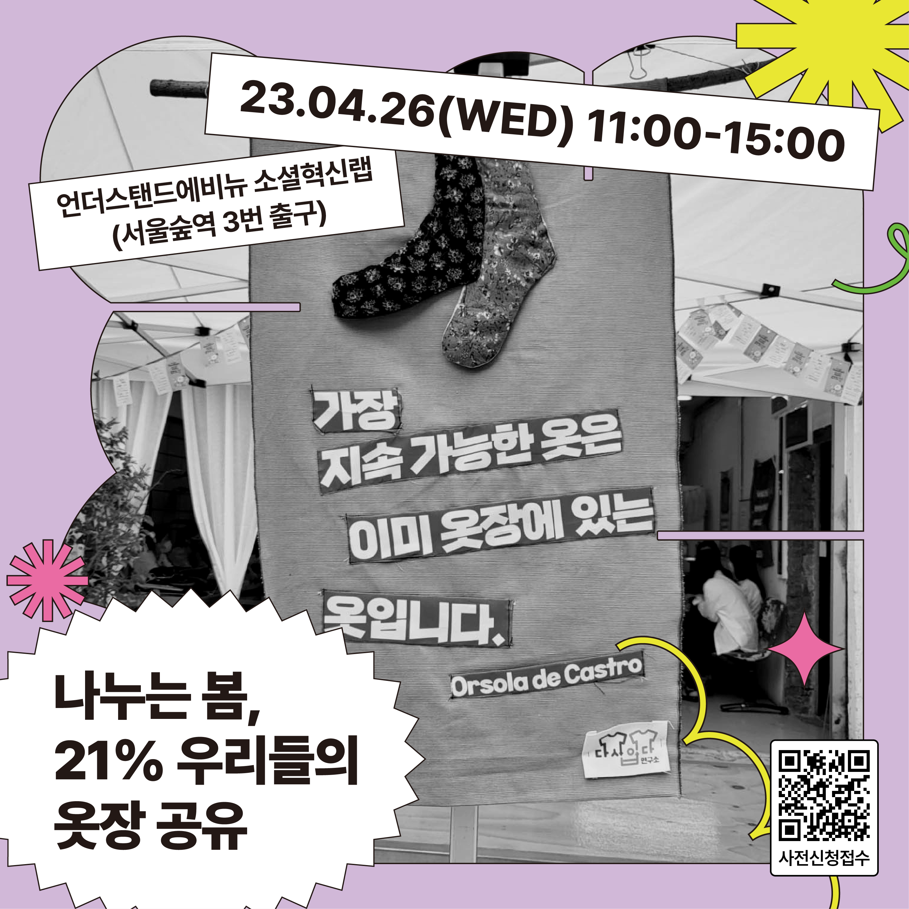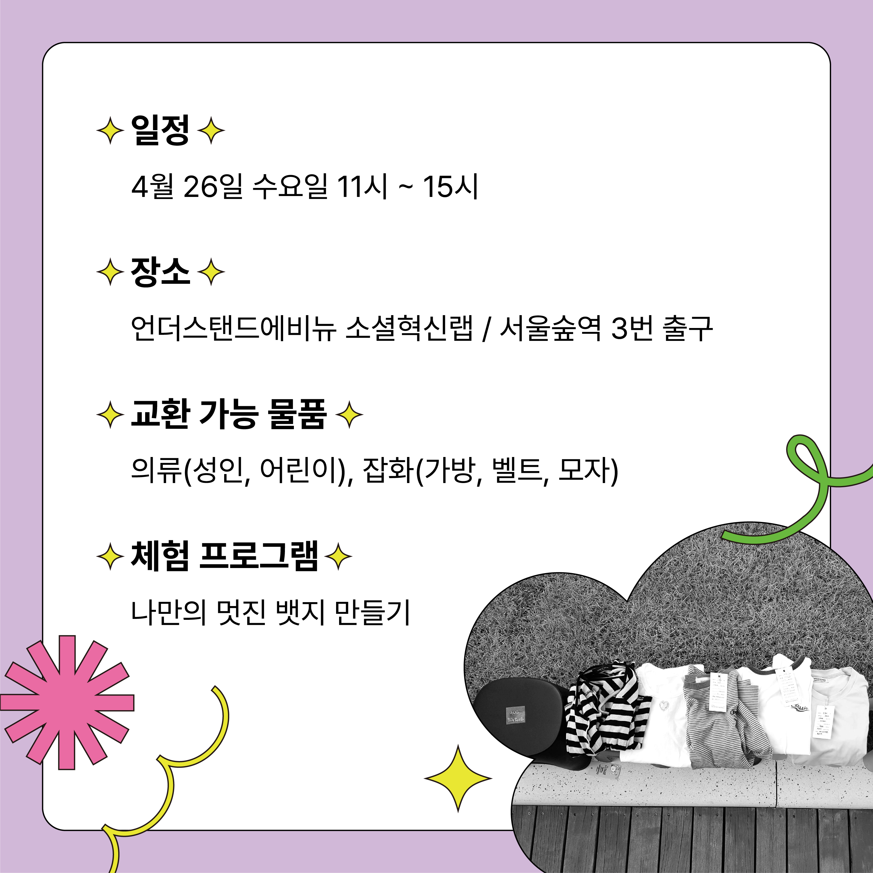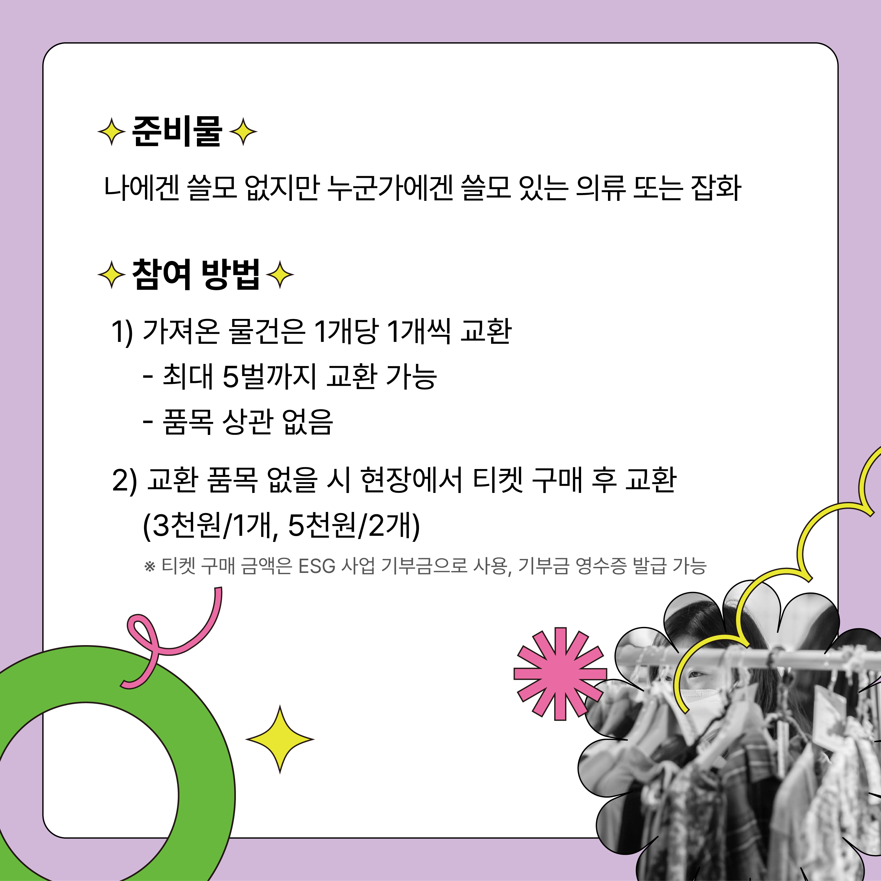 ☑️일시: 2023.04.26(수) 11시 - 15시 ☑️장소: 언더스탠드에비뉴 소셜혁신랩 (서울숲역 3번출구) ☑️입장료: 무료 ☑️준비물: 나에겐 쓸모 없지만, 누군가에겐 쓸모 있는 의류 또는 잡화 ☑️참여 방법 1) 가져온 물건은 1개당 1개씩 교환 가능합니다. (품목 상관 X) 2) 교환할 물건이 없는 경우, 현장에서 티켓 구매 후 참여 가능합니다. (3천원 / 1개, 5천원 / 2개) - 티켓 구매 금액은 ESG 사업 기부금으로 사용됩니다. - 희망 시, 기부금 영수증 발급 가능합니다. ☑️신청: 구글폼 신청서 제출(https://forms.gle/Nh8JH9YLKxBnwm6z9) ☑️문의: 02-725-5526