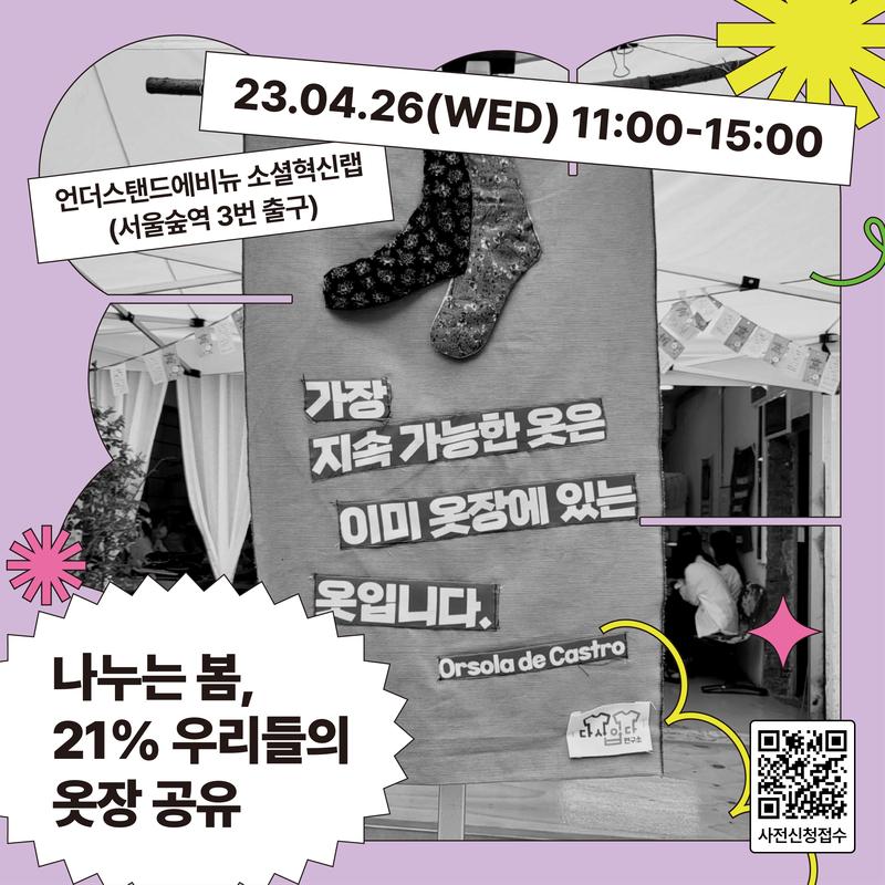 우리 옷장에 입지 않은 옷의 비율은 얼마나 될까요? 평균적으로 옷장의 21%를 차지하고 있대요. <나누는 봄, 21% 우리들의 옷장 공유>는 1:1 물물 교환 방식으로 진행되는 의류 시장이에요. 나에게는 더 이상 쓸모 없지만 누군가에게는 쓸모 있는 의류를 교환합니다. 4월 26일, 언더스탠드에비뉴에 오셔서 여러분들의 옷장을 공유해주세요! 이번 봄에는 <나누는 봄, 21% 우리들의 옷장 공유>에서 새로운 옷을 장만해보세요. 그리고 지속가능한 의류 소비 문화에 대해 함께 고민해봅시다!