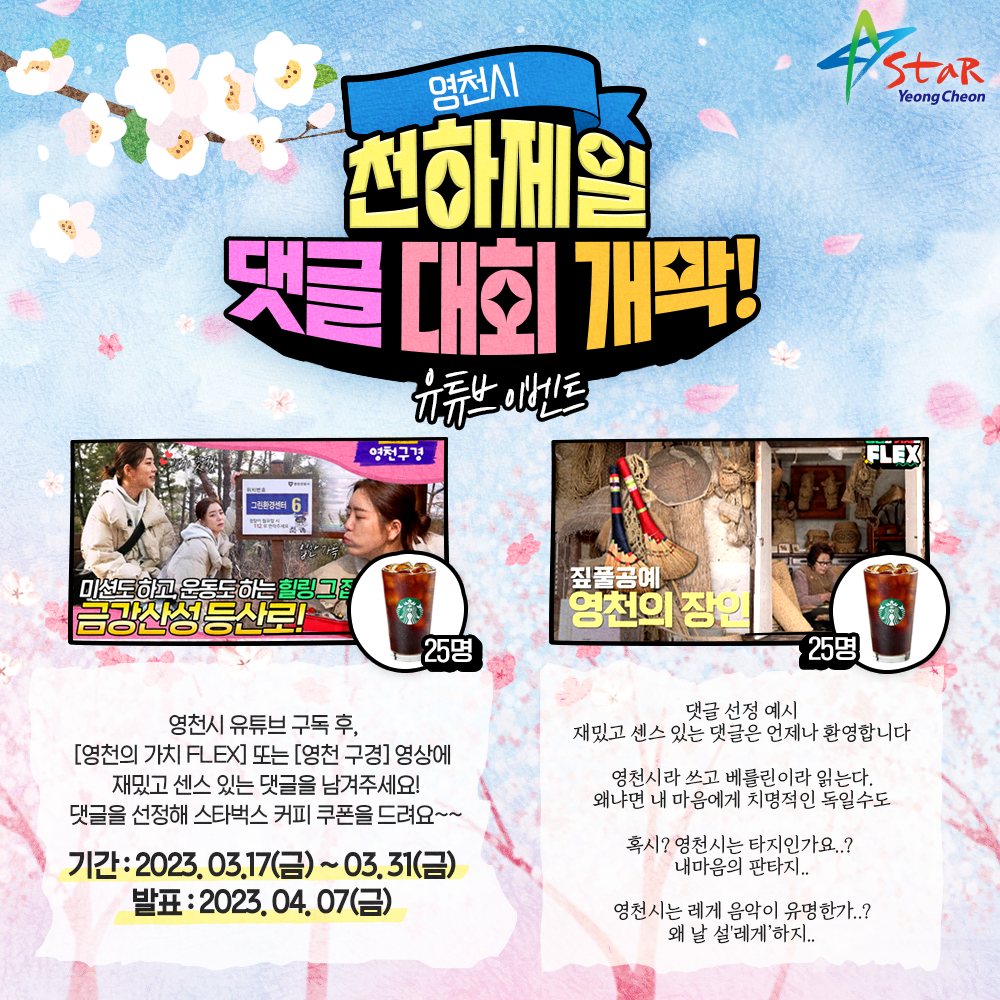 싱그러운 봄바람과 함께 2023년 영천시에 찾아온 🎁🎁🎁🎁 천하제일 댓글 대회 개막! ❤이벤트 기간 2023.03.17.(금)\~ 03.31(금) ❤당첨자 발표 2023.04.07.(금) 영천시 유튜브를 구독하고! 영천시 구경/FLEX 영상 시청 센스 넘치고 재밌는 댓글과 좋아요를 눌러주시면 달달한 커피를 영천시가 쏩니다! 댓글 예시 영천시라 쓰고 베를린이라 읽는다. 왜냐면 내 마음에게 치명적인 독일수도.. 혹시? 영천시는 타지인가요..? 내마음의 판타지.. 영천시는 레게 음악이 유명한가...? 왜 날 설‘레게’하지.. 더욱 재밌는 댓글이 있다면 아래 링크로 클릭 ↓↓↓↓↓↓↓↓↓↓↓↓ https://naver.me/5Rt9B1Ev 영천시 유튜브 구독/좋아요 부탁드릴게요❤❤