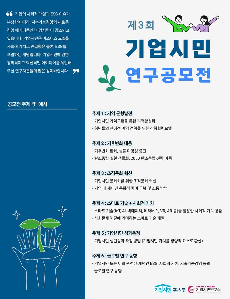 기업의 사회적 책임과 ESG 이슈가 부상함에 따라, 지속가능경영의 새로운 경영 메커니즘인 '기업시민'이 강조되고 있습니다. 기업시민은 비즈니스 모델을 사회적 가치로 연결하는 핵심 개념이자 ESG를 포괄하는 개념입니다. 포스텍 기업시민연구소에서는 기업시민에 관한 창의적이고 혁신적인 아이디어를 모집하기 위해 <제3회 기업시민 연구공모전>을 개최하고자 합니다. 기업시민 연구에 관심을 가진 연구자분들의 많은 참여바랍니다.
