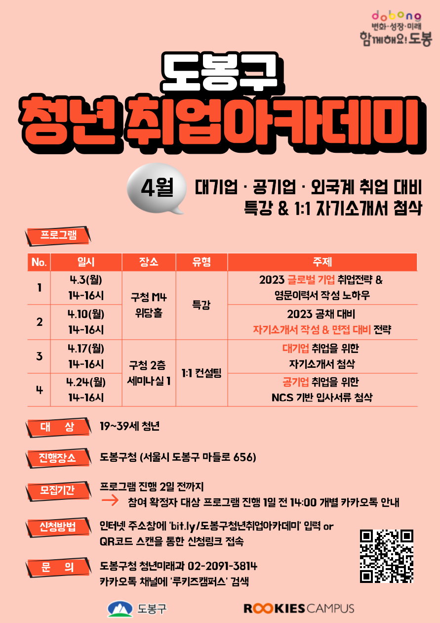 2023 도봉구 청년 취업아카데미 4월 프로그램 OPEN! <대기업·공기업·외국계 취업 대비 특강 & 1:1 자기소개서 첨삭> 대기업, 공기업, 외국계 기업 취업을 희망하시는 분들은 주목! 실제 취업 전문가 및 컨설턴트를 만나 뵙고 특강 & 1:1 자기소개서 첨삭을 받을 수 있는 기회