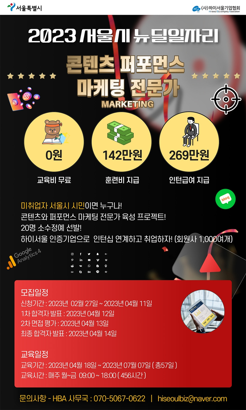 [하이서울기업협회] 서울시 뉴딜 콘텐츠 퍼포먼스 마케팅 전문가 과정 모집 (\~4/11) [콘텐츠 퍼포먼스 마케팅 전문가] 양성과정은 서울특별시에서 주최하고 (사)하이서울기업에서 주관하는 사업입니다. 전액 무료로 진행되며 하이서울 인증기업으로 인턴십 연계도 지원하니, 관심 있으신 분들은 신청바랍니다! ▶ 주최/주관 - 주최 : 서울특별시 - 주관 : (사)하이서울기업협회 ▶ 활동명 - 콘텐츠 퍼포먼스 마케팅 전문가 과정 ▶ 모집 일정 - 신청기간 : 2023.02.27(월) \~ 2023.04.11(화) 23:59까지 - 1차 합격자 발표 : 2023.04.12(수) 합격자/불합격자 모두 개별적으로 안내 예정 - 2차 면접 평가 : 2023.04.13(목) - 최종합격자 발표 : 2023.04.14(금) 합격자/불합격자 모두 개별적으로 안내 예정 ▶ 모집 대상 - 미취업자 서울시 시민이면 누구나! - 공고일 기준\, 만 19세 이상 39세 이하의 서울시민 중 취업의사가 있는 지원자 - 미취업 상태인 지원자 및 대학/대학원 졸업예정자 (재학/휴학 중인 지원자는 제외) - 서울형 뉴딜일자리 사업 참여 경력이 총합 23개월을 초과하지 않은 지원자 ※ 공고일 기준 현재 자격요건을 충족하고 배제사유가 없어야 하며, 채용 공고일 기준 자격요건은 사업 참여 종료 시까지 유지되어야 함 ▶ 모집인원 - 20명 ▶ 교육일정 - 2023.04.18 \~ 2023.07.07. (총57일 456시간 교육) - 매주 월\~금 9:00 \~18:00 (1일 8시간) ※ 대면수업(오프라인 교육)으로 진행됩니다! ▶ 교육장소 - 추후 개별 안내 예정 (서울 송파구/강남구 부근) ▶ 혜택 - 교육비 100% 전액지원 - 교육 훈련비 지급 (1일 25\,000원) - 취업컨설팅 - 인턴십 연계 및 인턴 3개월 인건비 지급 ▶ 접수방법/URL - 자세한 접수방법은 하단의 링크를 통해 확인 가능합니다! https://img.exc.co.kr/academy/2023/campuz/marketing.html ▶ 문의 HBA 사무국 070-5067-0622 메일주소 : hiseoulbiz@naver.com 카카오톡 : 엑스퍼트아카데미