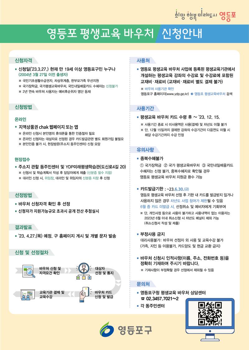 엠Zi 부터 할부Zi까지 만 19세 이상 영등포 구민이라면 누구나! 미뤄둔 배움의 시간! 평생교육바우처를 통해 지금 바로 시작하자! ◆ 신청자격 ◆ 신청일(23.03.27) 현재 만 19세 이상 영등포구민 누구나 (2004년 03월 27일 이전 출생자) - 국민기초생활수급권자\, 차상위계층\, 한부모가족 우선지원 - 국가장학금\, 국가평생교육바우처\, 국민내일배움카드 수혜자는 신청불가 - 2년 연속 바우처 사용자는 예비후순위자 명단 등제 ◆ 신청방법 ◆ 1. 온라인 지역상품권chak 웹페이지 또는 앱 2. 현장접수 주소지 관할 동 주민센터 및 YDP미래평생학습관(도신로4길 20) ◆ 선정방법 ◆ 바우처 신청자격 확인 후 선정 신청자가 지원가능 규모 초과시 공개 전산 추첨실시 ◆ 결과발표 ◆ 23.04.27(목) 예정 영등포구청 홈페이지 게시 및 개별 문자 발송 자세한 안내는 아래 홈페이지에서 확인하세요! https://www.ydp.go.kr/reserve/contents.do?key=5425