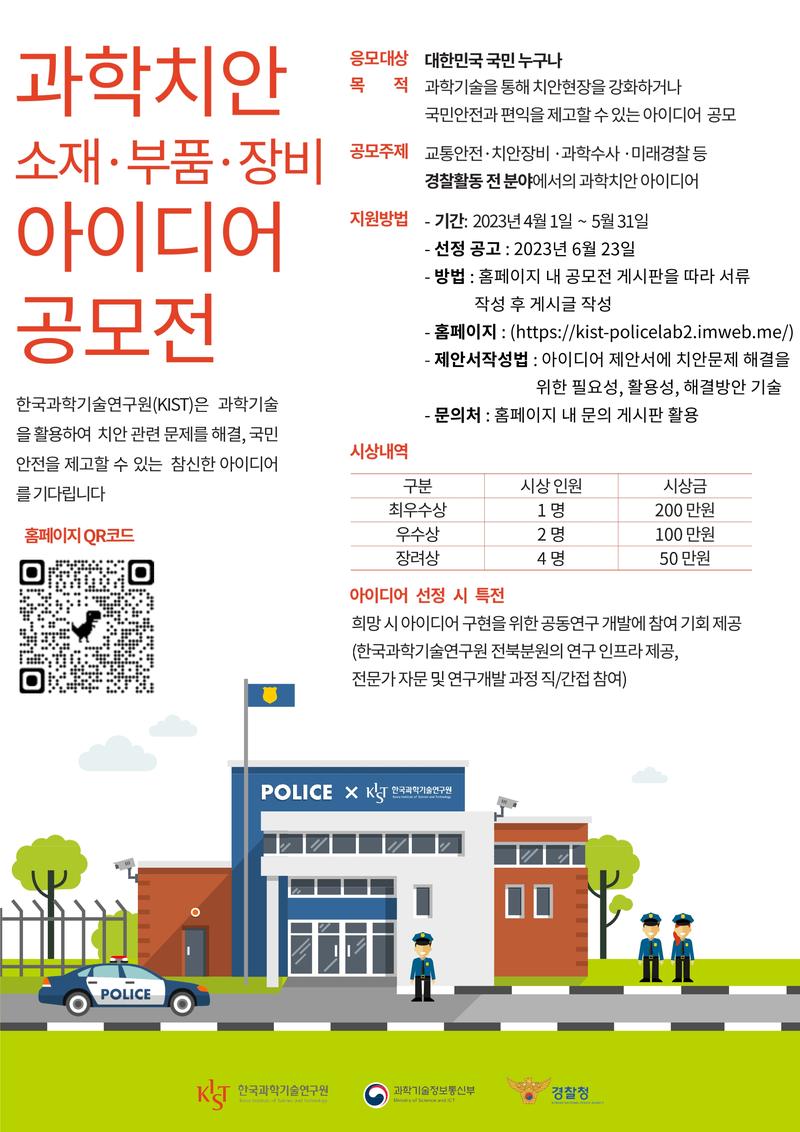 ■ 지원 방법 - 기간: 2023년 4월 1일 \~ 5월 31일 - 선정 공고: 2023년 6월 23일 - 홈페이지 : https://kist-policelab2.imweb.me/index - 지원 방법: 홈페이지 내 공모전 게시판에서 공모전 양식을 다운받아 작성 후 게시글로 작성 - 제안서 작성법: 아이디어 제안서에 치안문제 해결을 위해 필요성\, 활용성\, 해결방안에 대해 기술