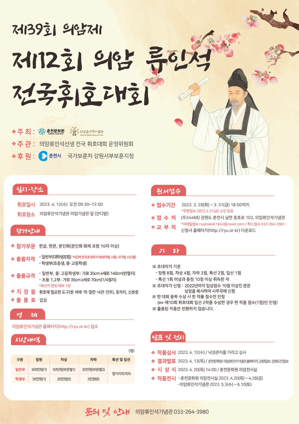 ● 접수 방법 - 우편 : 강원도 춘천시 남면 충효로 1503 - 이메일 : ryuinseok1842@naver.com - 팩스 : 033-264-3981