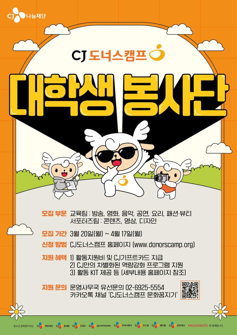 ▶ 모집개요 - CJ도너스캠프 청소년 문화동아리와 매칭되어 문화를 통한 청소년들의 성장을 지원하는 대학생 봉사단을 모집합니다.