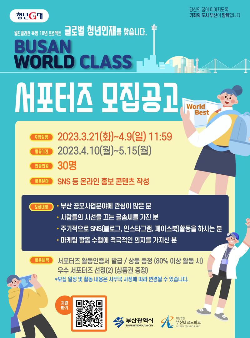 ○ 목 적 : 부산의 미래를 이끌어 갈 월드클래스 청년 Top3 선발 ○ 주 최 사 : 부산광역시, 부산테크노파크 ○ 모집 개요 ⏵ 모집 대상 (30명) - 주기적으로 SNS(블로그, 인스타그램, 페이스북 등) 활동을 하시는 분 - 마케팅 활동 수행에 적극적인 의지를 가지신 분 ⏵ 모집 기간 - 2023.03.21(화) \~ 2023.04.09(일) 23:59까지 ⏵ 선정발표 - 2023.04.10(월) *개별 통지 예정 ○ 활동 개요 ⏵ 활동 기간 : 2023.04.10(월) \~ 2023.05.15(월) ⏵ 활동 내용 - 홍보 콘텐츠 제작 및 개인 SNS로 확산 (카드뉴스, 포스트, 영상 제작 등) ○ 참여 혜택 - 서포터즈 활동 인증서 발급 - 상품 증정 (80% 이상 활동 시) - 우수 서포터즈 선정(2) (상품권 증정) ○ 접수 방법 -온라인 접수 >>https://naver.me/x1gTGtwc ○ 문의처 2023 월드클래스 운영사무국 (주)리컨벤션 T. 070-4239-2708 E. hyang@leeconvention.com *모집 일정 및 활동 내용은 사무국 사정에 따라 변경될 수 있습니다.