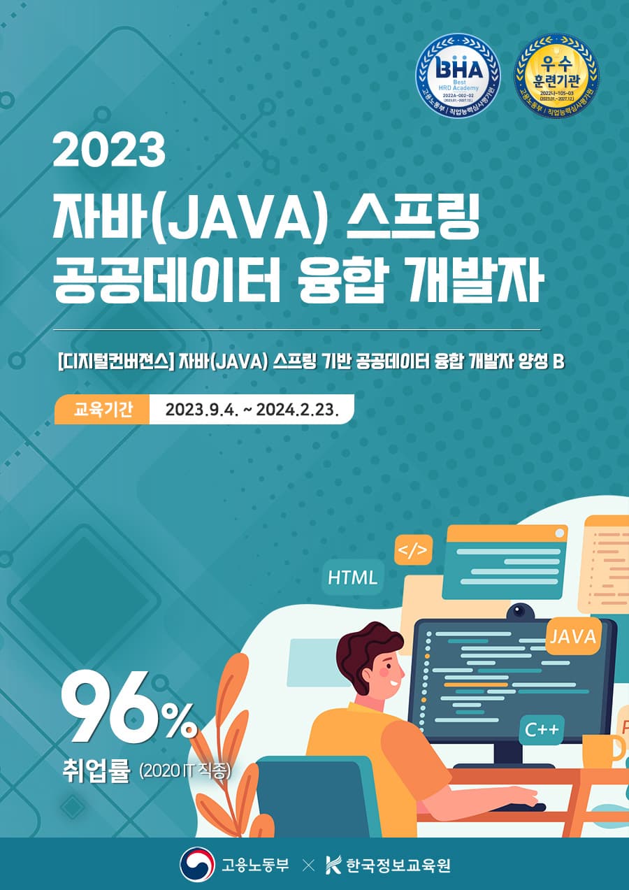 ○ 신청기간 : 2023년 03월 20일 월요일 \~ 2023년 09월 11일 월요일 ○ 교육기간 : 2023년 09월 04일 월요일 \~ 2024년 02월 23일 금요일 ○ 교육대상 : IT분야 자바 개발자로 취업을 희망하는 국민 누구나 ○ 신청방법 : 홈페이지 또는 방문 접수 ○ 담당자 이메일 : kyoungwon199@naver.com ○ 담당자 전화번호 : 02-855-9611