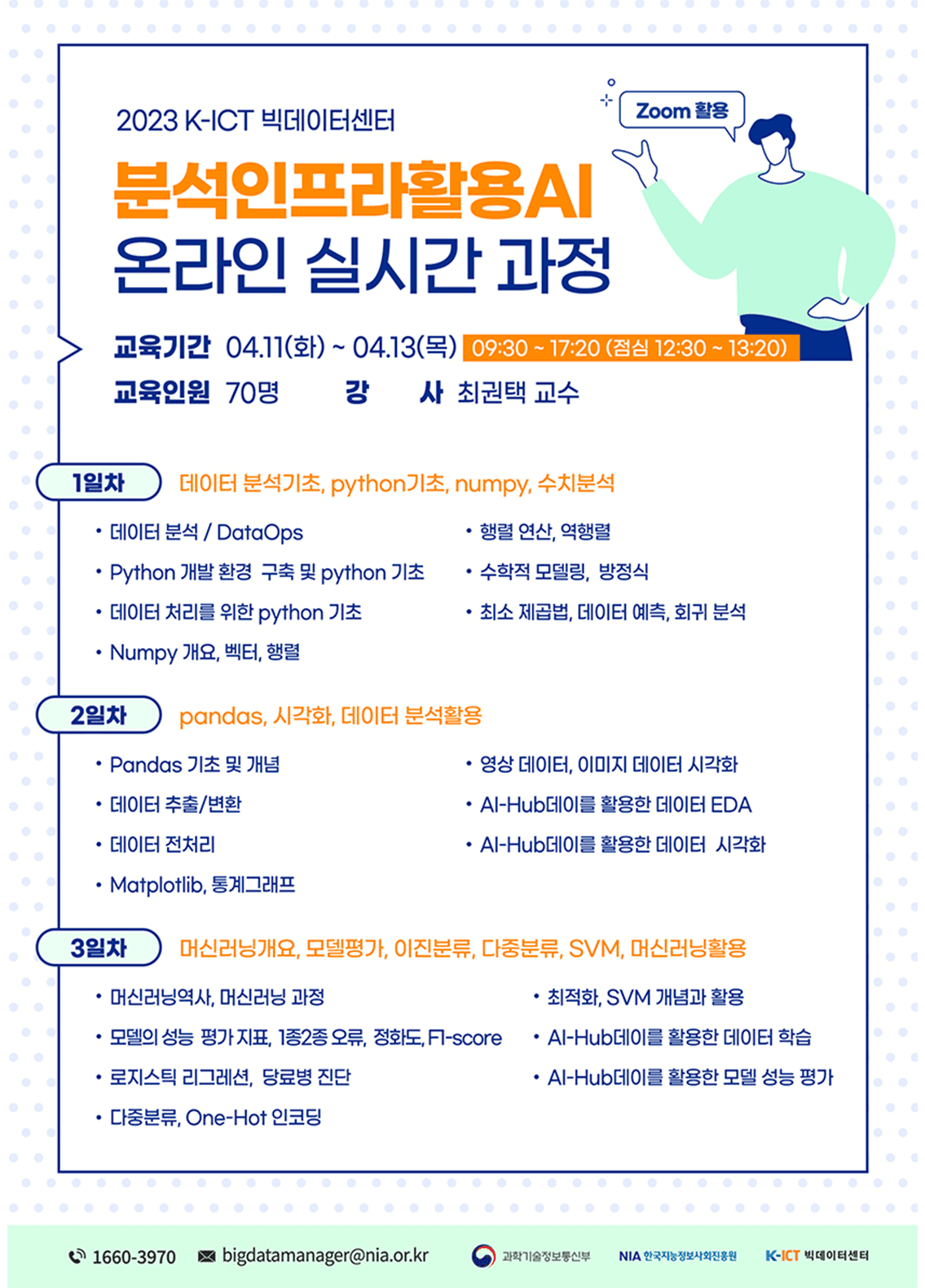 내용: 스트리밍 줌을 통한 개인정보 분석인프라활용AI 온라인 실시간 과정 수강생 모집. 신청방법: K-ICT 빅데이터센터 홈페이지 (https://kbig.kr/) 회원가입 후 수강신청 문의: 1660-3970 / bigdatamanager@nia.or.kr