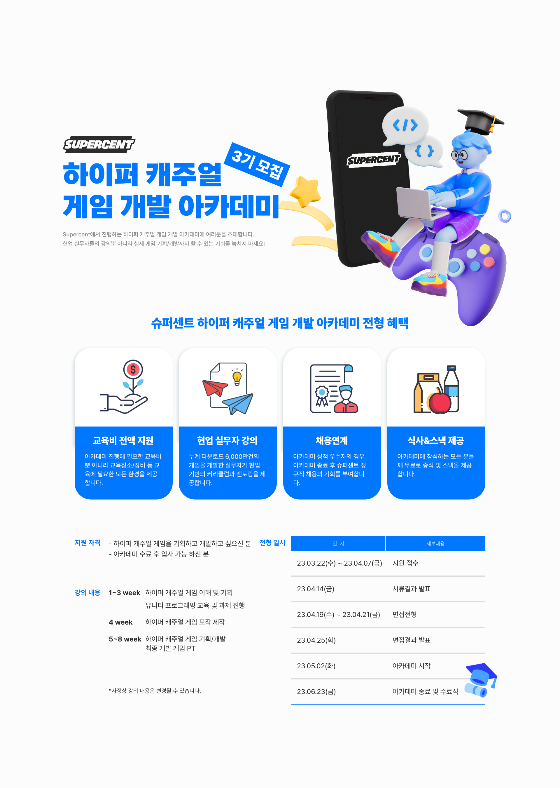 [지원자격] • 하이퍼 캐주얼 게임을 직접 기획하고 개발하고 싶으신 분 • 아카데미 수료 후 입사 가능하신 분 [강의 내용] • 1\~3주차 - 하이퍼 캐주얼 게임 이해 및 분석 유니티 프로그래밍 교육 및 과제 진행 • 4주차 - 하이퍼 캐주얼 게임 모작 제작 • 5\~8주차 - 하이퍼 캐주얼 게임 기획 / 개발 최종 개발 게임 PT [전형 일정] • 지원접수 - 23년 3월 22일(수) \~ 23년 4월 7일(금) • 서류결과 발표 - 23년 4월 14일(금) • 면접결과 발표 - 23년 4월 25일(화) • 아카데미 시작 - 23년 5월 2일(화) [전형혜택] • 채용연계 - 성적 우수 교육생은 정규직 채용 기회 부여 • 멘토링 - 현업 개발자/아티스트의 실시간 멘토링 • 교육비 전액 지원 - 아카데미 진행과 관련된 모든 교육/장비 비용 지원 • 식사&스낵 제공 - 회사비용으로 이용 가능 [지원방법] • 슈퍼센트 하이퍼 캐주얼 게임 개발 아카데미 홈페이지 내 신청서 작성 (https://supercent.io/academy) [유의사항] • 접수 시 정확한 개인정보를 입력해주세요. 만약, 잘못 기입하거나 일치하지 않을 경우 지원/활동이 취소될 수 있습니다. • 개인정보 수집·이용에 동의한 개인들을 대상으로 진행됩니다. 제출 이 후 개인정보 수집·이용 동의 철회 시제외되오니 참고 바랍니다. • 일정 및 강의 내용은 아카데미 진행 상황에 따라 변동될 수 있습니다. [문의사항] • recruit@supercent.io로 문의 부탁드립니다.