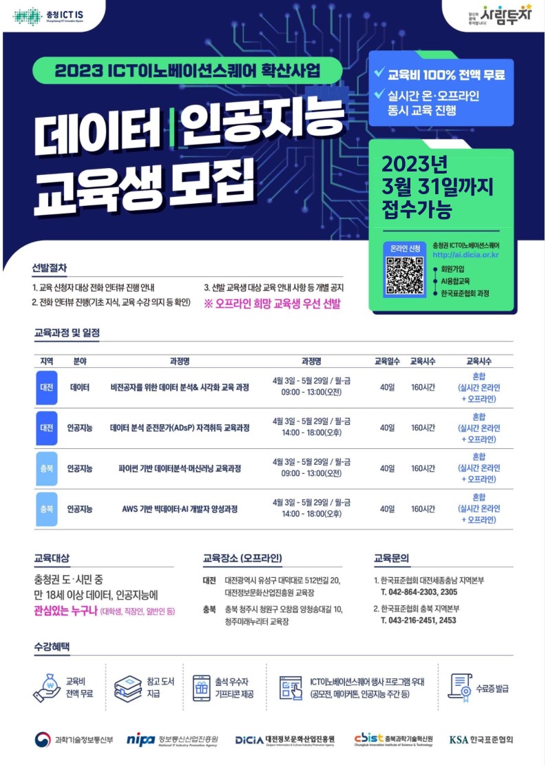 : 충청권 ICT 이노베이션스퀘어 http://ai.dicia.or.kr → 회원가입 → AI융합교육 - 인공지능/온라인코딩 → [충북] 한국표준협회과정