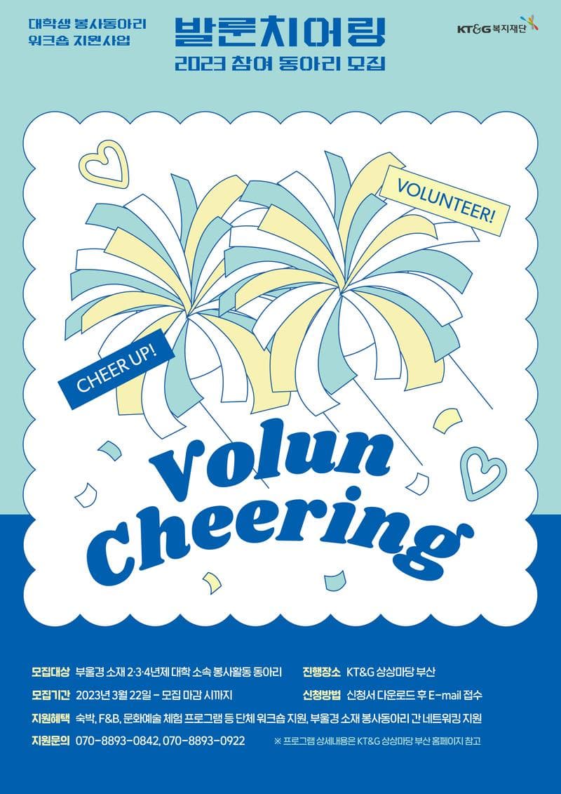 ■ 사업개요 Cheer up! Volunteer KT&G복지재단의 '발룬치어링'은 지속적인 봉사활동으로 나눔의 가치를 실현하고 있는 자원봉사자(Volunteer)들을 격려(Cheering)하기 위해 역량 강화와 문화예술 향유의 기회를 제공하는 대학생 봉사동아리 워크숍 지원 사업입니다.