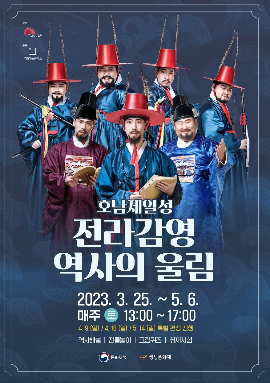 [행사 소개] '호남제일성, 전라감영 역사의 울림'은 조선왕조 500년 동안 전라도와 제주도의 정치, 경제, 문화를 아우른 최고의 통치기관 '전라감영'만이 가지고 있는 문화유산과 조선의 역사를 스토리텔링하고 전통놀이와 게임, 퀴즈 등의 문화콘텐츠를 즐길 수 있는 역사문화 체험 프로그램입니다. -기간 : 2023. 3. 25.(토) \~ 2023. 5. 6.(토) 매주 토요일(총 10회) ※ 4. 9.(일) / 4. 16.(일) / 5. 14.(일) 특별 편성 진행 -시간 : 오후 1시 \~ 5시 -장소 : 전라감영 -참가방법 : 현장 무료 관람