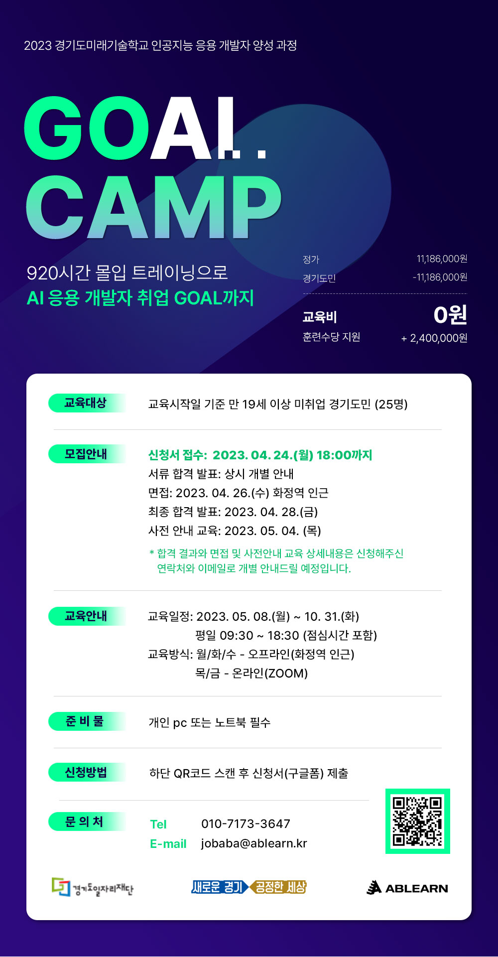 미취업 경기도민 교육비 전액무료! 훈련지원금 240만원 지원 920시간 몰입 트레이닝으로 AI 응용 개발자 취업 GOAL까지 한번에! 경기도x경기도일자리재단x에이블런 GOAI CAMP 교육생 모집 중