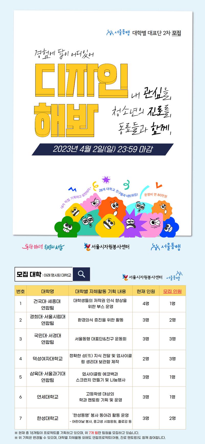 [활동일정] - 연합 프로젝트 : 4월 \~ 10월 - 대학별 활동 및 서울동행 브랜드 홍보 : 4월 \~ 11월\, 연 최소 2회 - 오리엔테이션 및 교육 ① 오리엔테이션 : 4월 7일(금) 19:00\~21:00, 온라인 진행 ② 마음성장 및 라이프디자인 워크숍 : 5월 20일(토) ③ 중간회고 : 7월 1일(토) ④ 최종회고 : 11월 4일(토) ⑤ 성과공유회 : 11월 25일(토)