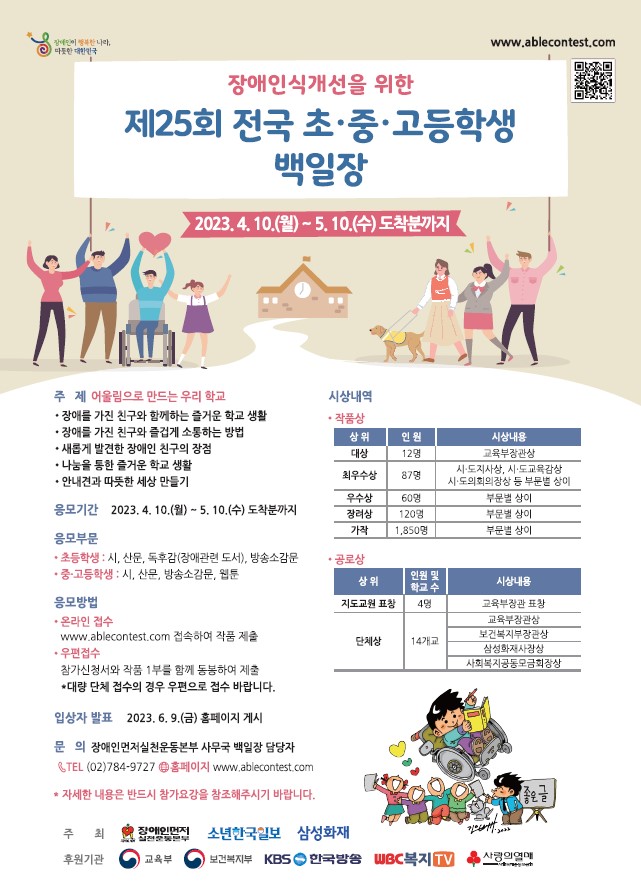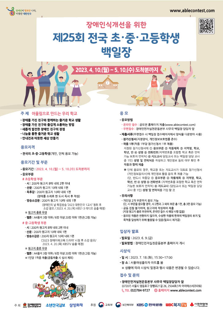 ● 응모 내용 -초등학생 : 시, 산문, 독후감, 방송소감문 -중,고등학생 : 시, 산문, 방송소감문, 웹툰 ※ 방송소감문은 반드시 초등학생은 장애인의 날 특별기획 ‘2023 대한민국 1교시’를 청취, 중, 고등학생은 ‘갈채’를 시청 후 소감 응모 ● 접수 방법 - 온라인접수 : www.ablecontest.com 접속하여 작품 제출(*4월 6일 오픈 예정) -우편 접수 : 참가신청서와 작품 1부를 함께 첨부하여 제출
