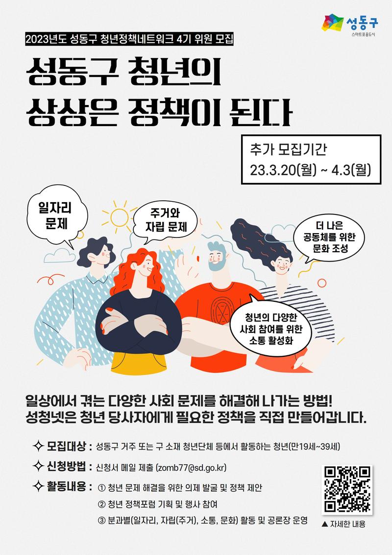 "성동구 청년정책네트워크 4기 위원 모집" 성동구 청년의 보다 나은 삶을 위해 직접 청년 문제를 발굴하고 그 해결 방법을 모색합니다. 그리고 우리가 찾은 청년 문제와 해결 방법을 성동구의 많은 청년들과 공유하기 위해 '성동구 청년 정책포럼'을 기획하여 운영합니다! 청년들의 이야기, 성동구의 이야기를 함께 나누고자 하는 청년의 많은 지원 바랍니다.