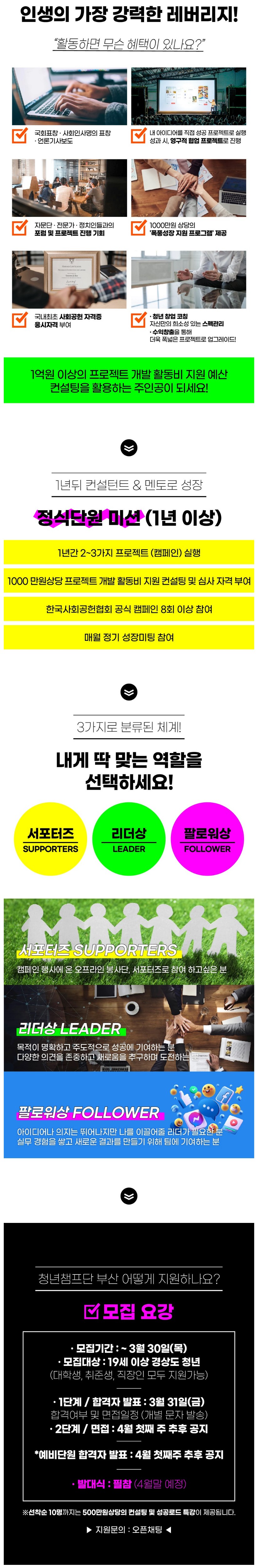 모집대상 : 19세 이상 경상도 청년 (대학생, 취준생, 직장인 모두 지원가능) -1단계 합격자 발표 : 3월 31일(금) 합격여부 및 면접일정 개별 문자 발송 모집기간: \~ 3월 30일(목) -예비단원 합격자 발표 : 4월 첫째주 추후 공지 -발대식 : 필참 (일정 추후 공지, 4월말 예정) ※선착순 10명까지는 500만원상당의 컨설팅 및 성공로드 특강이 제공됩니다 챔프단만의 특별함! (1) 사회공헌캠페인 기획&실행 기회, 경력 증명서/수료증 발급 (2) 국내최초 사회공헌 자격증 응시 자격 부여 (3) 100여개의 협회 회원사 추천서 (4) 언론 기사보도 (5) 각 기수 팀 우수자 선별 국회표창, 사회인사명의 표창 다수 (6) 청년창업 코칭, 자신만의 희소성 있는 스펙 관리, 1000만원 상당의 역량강화 특강 제공 (7) 개인별 분석 및 스트랭스 강화 관리 시스템 진행 (8) 각종 커뮤니티 행사 및 포럼참여 기회를 통한 인맥 구축 (임원진, 자문단, 전문가, 정치인 들과의 포럼 및 프로젝트 참여기회) (9) 내 아이디어로 직접 기획하는 프로젝트 실행 기회 (10) 인플루언서 및 연예인들과 함께하는 캠페인 활동 (11) 봉사시간 수여 (12) N사 최저가 보다 저렴한 복지몰 제공