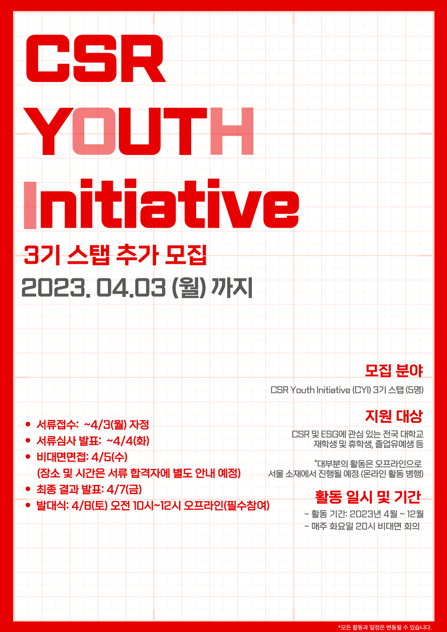 [ 청년 CSR 협의체, CYI 3기 스탭 추가 모집 ] CYI (CSR Youth Initiative)는 대한민국을 대표하는 CSR 기업 담당자들의 모임, CSR포럼의 산하 단체로 기업과의 연계를 통해 대학생들의 실무 역량을 강화하는 청년 협의체입니다. 청년들의 눈으로 사회문제를 바라보고 그 해결방안을 기업과 함께 연구하며 CSR을 통해 사회에 선한 영향력을 확산하고자 합니다. 여러분들의 많은 관심과 지원 부탁드립니다! ----- ♣ 혜택 ⇨ 실무진과 한달 커리큘럼의 CSR 스터디 진행(2022년 참여 실무진 : CJ ENM 부장, CSR FORUM 대표) ⇨ 기업 연계 CSR 제안서 PT 참여 기회 제공 (2022년 참여 기업:쿠첸, 삼성 디스플레이, 뉴스킨 코리아) ⇨ 교육기부, 청년 보건의료, 해외봉사, 문화 콘텐츠 기획 등 다양한 분야의 청년단체들이 CYI에 속해 활동함으로써 사회 문제 인사이트 배양 ⇨ 청년단체 리크루팅 통해 인사담당업무 체험 가능 ⇨ 사회공헌 부서 실무진들과 인터뷰 진행(2022년 참여 기업:CJ E&M, 스마일 게이트, 에버영 코리아) ⇨ 활동 수료증 및 인증서 발급 ♣ 모집 대상 ⇨ CSR에 관심있는 열정적인 대학생 ⇨ 매주 화요일 저녁 8시 온라인 팀별 회의에 참여 가능한 대학생 ⇨ 오프라인 활동(서울 경기 지역)에 참여 가능한 대학생 필요시 서울 권역에서 오프라인 활동 진행 ♣ 2022년 CYI 주요 활동 내용 1 CLW ; CSR Learning Workshop = 실무진과 함께하는 CSR 스터디 ⇨대학생 교육 기부 단체 ‘꿈샘’과 협업하여 프로그램 기획 ⇨CSR FORUM 대표 김도영, CJ E&M 전창훈 부장 특강 및 케이스 스터디 진행 ⇨청년들의 CSR기초 지식 함양 및 인사이트 공유 자세한 내용은 https://cafe.naver.com/csryouthinitiative/163?boardType=L 2 CCS ; CSR CONNECTION SCHOOL = 기업 연계 CSR 제안서 PT ⇨문제 인식, 사전교육, 아이디어 모델, 문제 해결, 기대효과까지 제안서 작성의 전단계를 기업과 연계하여 진행 작년 예시사례). 기업 ‘쿠첸’과 2030세대 1인가구의 잘못된 식습관 문제 해결을 위해 갓생살기 캠페인 및 레시피 공모전 기획 ⇨기업 차원에서 실현 가능한 단계의 제안서를 직접 작성함으로써 실무 역량 강화 자세한 내용은 https://cafe.naver.com/csryouthinitiative/163?boardType=L 3 CCC ; CYI CONNECT COMPANY = 사회공헌 부서 실무진들과의 인터뷰 ⇨작년 1회차 스마일게이트, 2회차 CJ ENM, 3회차 에버영 코리아(네이버 계열사) ⇨청년이 묻고 기업이 답하는 리버스 형식의 인터뷰 진행 자세한 내용은 @cyi__official 4 이외 진행한 프로젝트 ⇨의성군 1박 행사 진행 ⇨CYI 공식 계정에 기업별 ESG사업 분석 피드 업로드 ⇨정기 봉사활동 진행 ⇨청년단체들과 정기 협의 ⇨주요 활동 진행 후 홍보 이벤트 기획 ♣ 활동기간 : 2022년 4월 – 12월 ♣ 소속 단체 (아래 단체에 소속되신 분은 CYI 스탭 지원이 불가합니다) Raise Uganda Now / 라이코스 / 서경대 청문단 / 꿈;샘 / 프리메드 / 통감 / 청년내일연구소 / 로그인 / 경기대 인액터스 ----- ♣ 모집 관련 ♧ 지원서 링크: https://docs.google.com/forms/d/e/1FAIpQLSfwrqi7xGxo1qrw547QiT3SndmYmxgNcTcCm4pq6d2Vwskb_g/viewform?usp=sf_link ♧ 서류 지원 마감: 4월 3일 (월) 자정 ♧ 서류 합격자 발표: 4월 4일 (화) ♧ 비대면 면접: 4월 5일 (수) ♧ 최종합격자 발표: 4월 6일 (목) ♧ 오프라인 발대식 : 4월 8일 (장소 : 강남 도곡동) ----- 문의: CYI 공식 인스타그램 (@cyi__official)