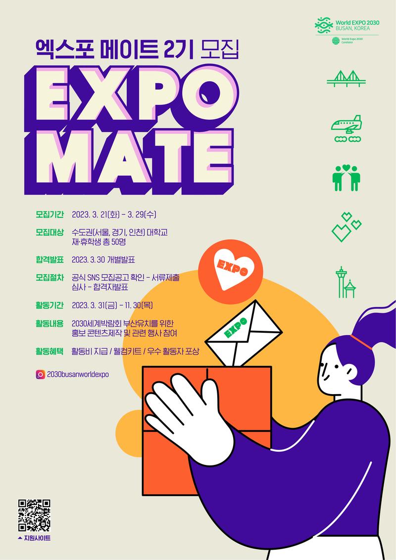 2030세계박람회 부산유치를 위한 홍보 히어로 ‘엑스포 메이트 2기’가 되어 누구보다 가까이서 유치를 응원할 수 있는 기회!