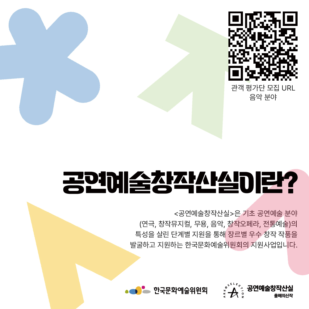 <공연예술창작산실>은 기초 공연예술 분야(연극, 창작뮤지컬, 무용, 음악, 창작오페라, 전통예술)의 특성을 살린 단계별 지원을 통해 장르별 우수 창작 작품을 발굴하고 지원하는 한국문화예술위원회의 지원사업입니다.