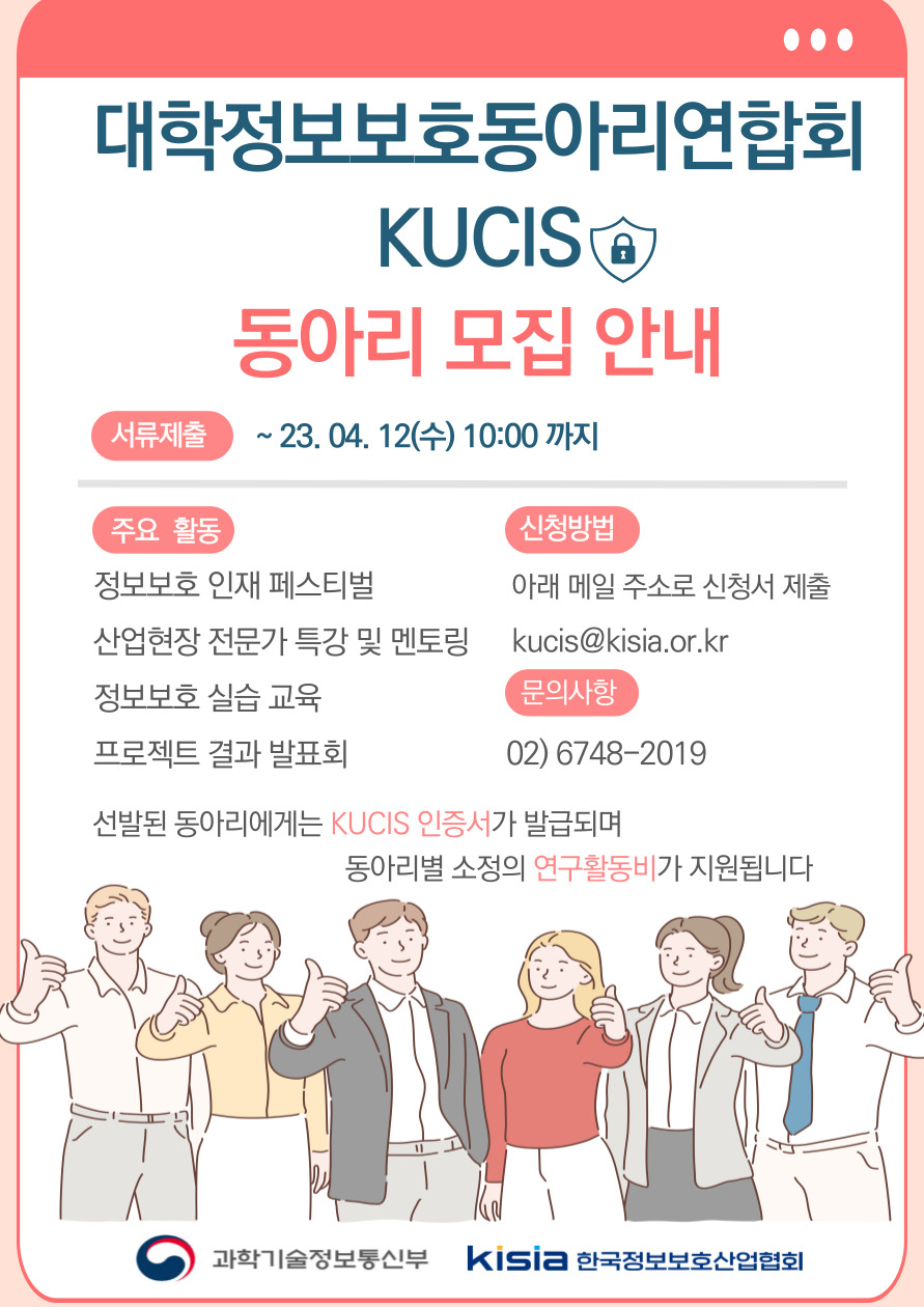▶ 모집대상 : 국내 2\~4년제 대학(원) 정보보호 관련 동아리 33개 ( 기존동아리 30개, 신규동아리 3개) ▶ 모집기간 : \~2023년 4월 12일(수) 14:00 까지 ▶ 지원방법 : 제출서류 일체를 압축(zip 형태)하여 이메일 제출 (kucis@kisia.or.kr) ▶ 선정기준 : 정보보호 관련 실적 및 활동계획을 종합적으로 평가하여 선정 (4월 중) ▶ 동아리 지원 프로그램 - 정보보호 인재 페스티벌 개최 - 정보보호 온라인 실습교육 운영 - 권역별 자율 세미나 지원 - 정보보호 멘토데이 개최 - 프로젝트 발표평가회 등 성과 발표 기회 제공 ▶ 동아리 연구활동 지원 및 포상 - 연구활동시 필요한 도서, 기자재, 온라인 교육 등을 위한 연구활동비 지원 - 활동 실적에 따른 우수동아리 시상 ▶ 문의 -교육기획팀 shinhelen@kisia.or.kr -02) 6748-2019