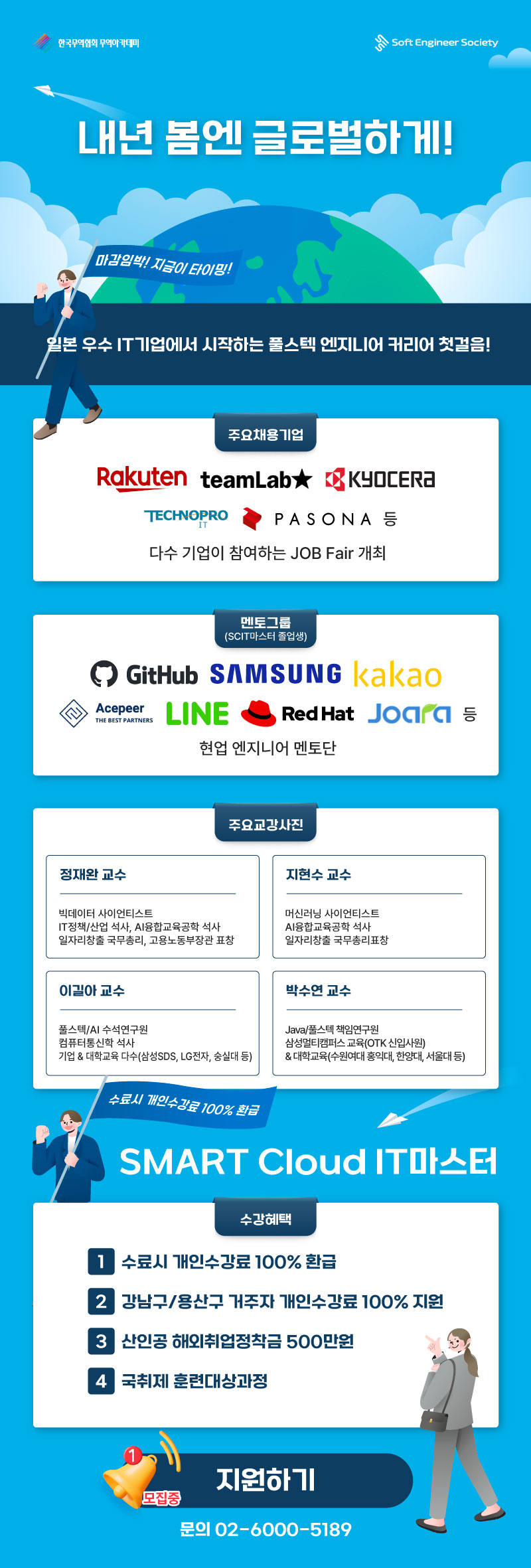 1. 과정 개요 ㅇ 과 정 명 : SMART Cloud IT마스터 과정(제44기) ㅇ 프로그램 : IT교육 + 일본어, 해외취업(취업컨설팅, 잡페어) ㅇ 참가대상 : 70명 내외, 2년제 대학교 이상 졸업(예정)자, 비전공자 가능