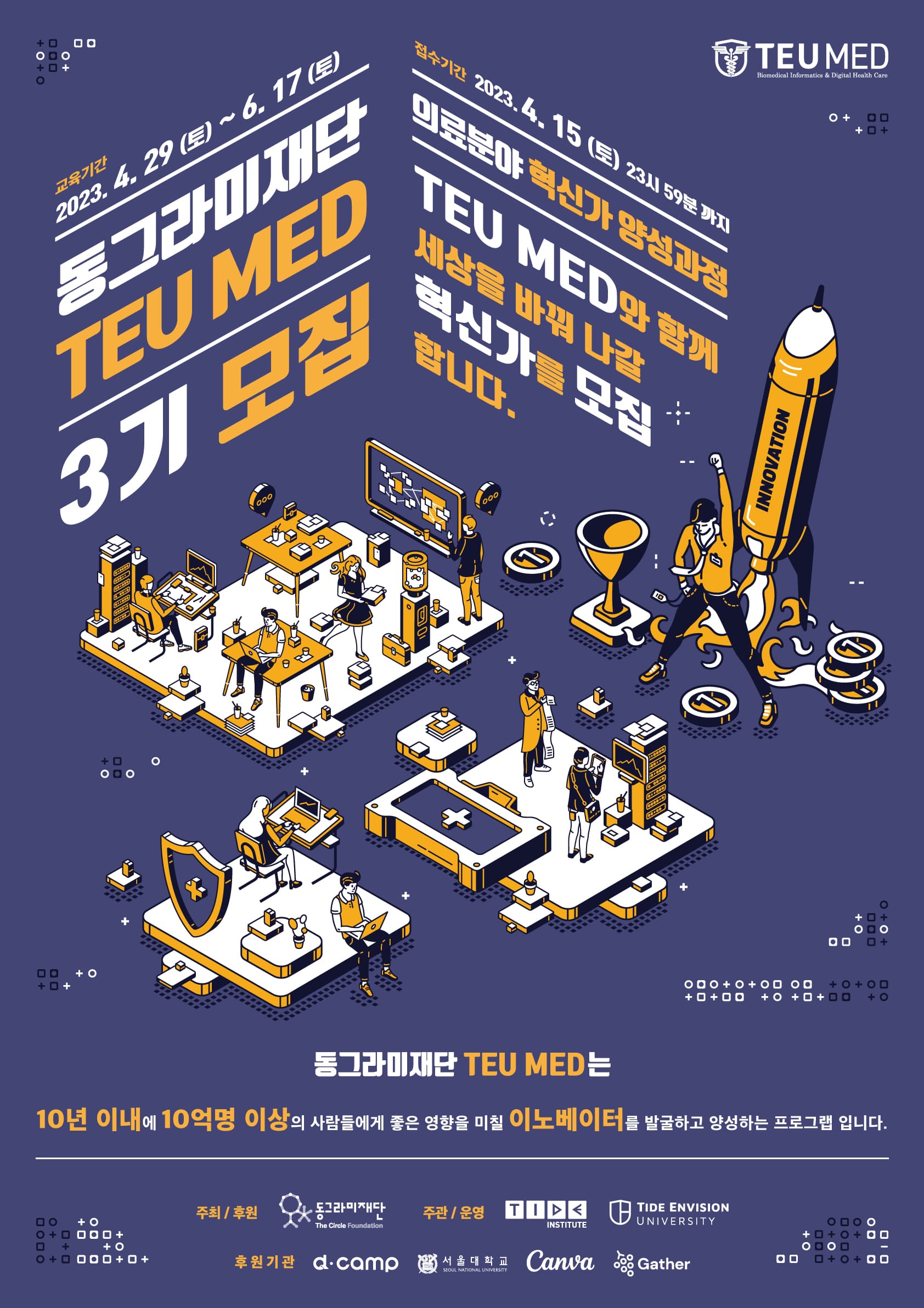 ● 모집개요 동그라미재단 TEU MED, 의료분야 혁신가 양성과정 3기를 모집합니다. 동그라미재단 TEU MED 프로그램은 바이오·메디컬 제품과 서비스를 통해 의료분야 난제를 해결하여 10년 이내에 10억명 이상의 사람들에게 좋은 영향을 미칠 이노베이터를 발굴·양성하는 프로그램 입니다. TEU MED는 10년 이내 10억명 이상의 사람들에게 선한 영향력을 줄 수 있는 혁신가를 기다리고 있습니다. 주최/후원 : 동그라미재단 주관/운영 : 타이드인스티튜트, TEU 후원 : D.camp, 서울대학교, Gater.town, Canva