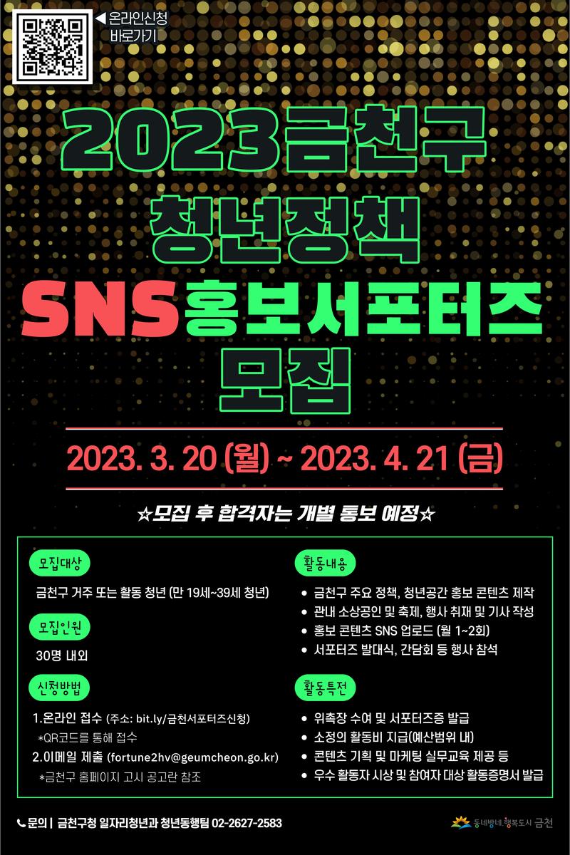 ○ 모집대상 : 금천구에 거주 또는 활동하는 만19\~39세 청년 ○ 지원자격 - SNS 홍보 콘텐츠(기사·카드뉴스·영상 등) 제작에 관심이 많은 자 - 6개월 동안 성실히 활동이 가능한 자 ※개인 SNS 계정 보유 및 활발히 활동하는 경우 선정 시 우대 ○ 모집기간 : 2023. 3. 20.(월) \~ 4. 21.(금) ○ 활동기간 : 2023. 5월 \~ 2023. 10월 [6개월] ○ 활동내용 : 금천구 주요정책, 청년공간 등 홍보 콘텐츠 제작 및 업로드 ○ 지원사항 : 활동증명서 발급, 활동비 지급 등 ○ 문 의 : 서울시 금천구청 일자리청년과(02-2627-2583) ○ 신청링크 : bit.ly/금천서포터즈신청