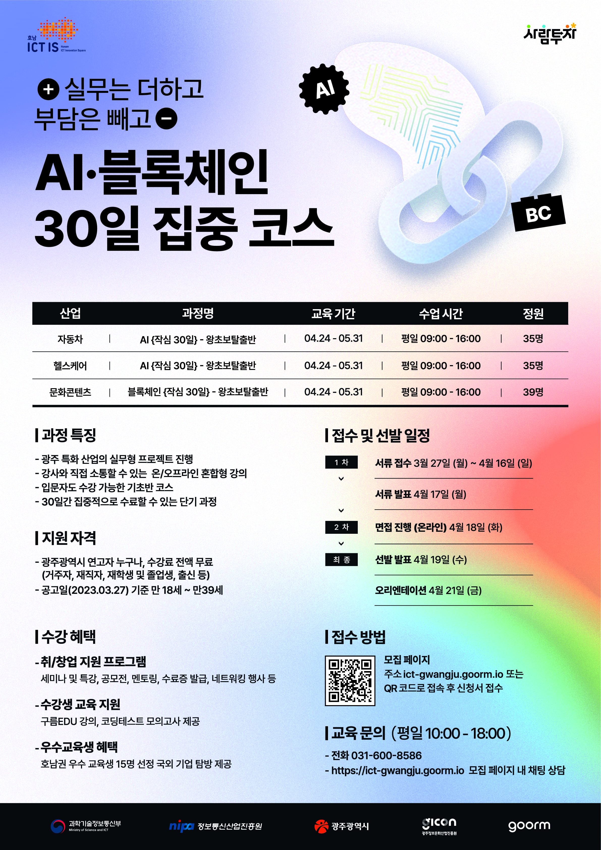 인공지능과 블록체인 분야에서 경쟁력을 갖추고자 하는 광주 청년들의 교육과 취/창업을 지원합니다.