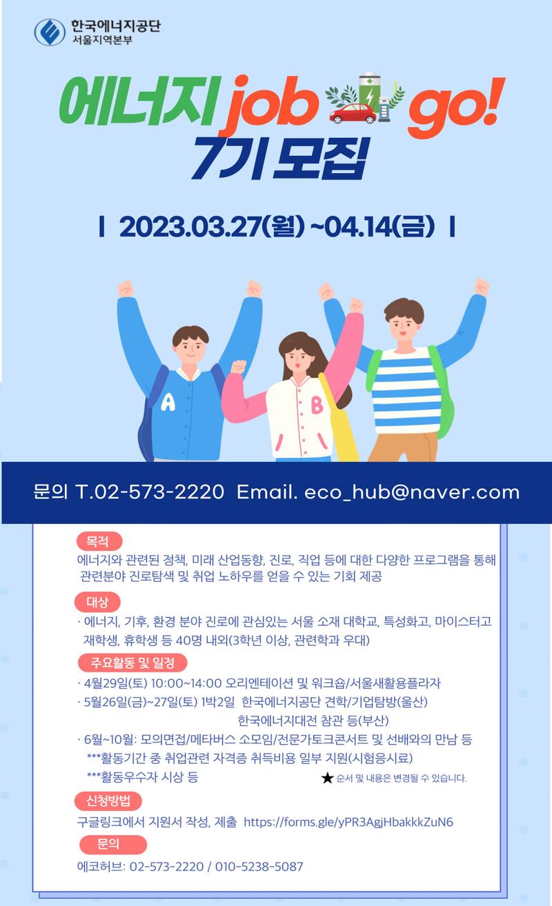 한국에너지공단 서울지역본부 제7기 <에너지 job go!> 모집 *목적: 에너지와 관련된 정책, 미래 산업동향, 진로, 직업 등에 대한 다양한 프로그램을 통해 관련분야 진로탐색 및 취업 노하우를 얻을 수 있는 기회 제공 *대상: 에너지, 기후, 환경분야 진로에 관심있는 서울 소재 대학교, 특성화고, 마이스터고 재학생, 휴학생 등 40명 내외 (3학년 이상, 관련학과 우대) *주요활동 및 일정 -4.29.(토) 10:00\~14:00 오리엔테이션 및 워크숍(서울새활용플라자) -5.26.(금)\~5.27.(토) 1박 2일: 한국에너지공단 견학, 에너지 기업 탐방(울산), 한국에너지대전 참관(부산) 등 -6월\~10월: 모의면접, 메타버스 소모임, 전문가 토크콘서트 및 선배와의 만남 등 **활동 기간 중 취업관련 자격증 취득비용 일부 지원(시험응시료) **수료기준 충족시 수료증 수여, 우수활동자 시상 등 *신청방법: 구글링크에서 지원서 작성, 제출 : https://forms.gle/yPR3AgjHbakkkZuN6 *문의: 에코허브 02-573-2220 010-5238-5087